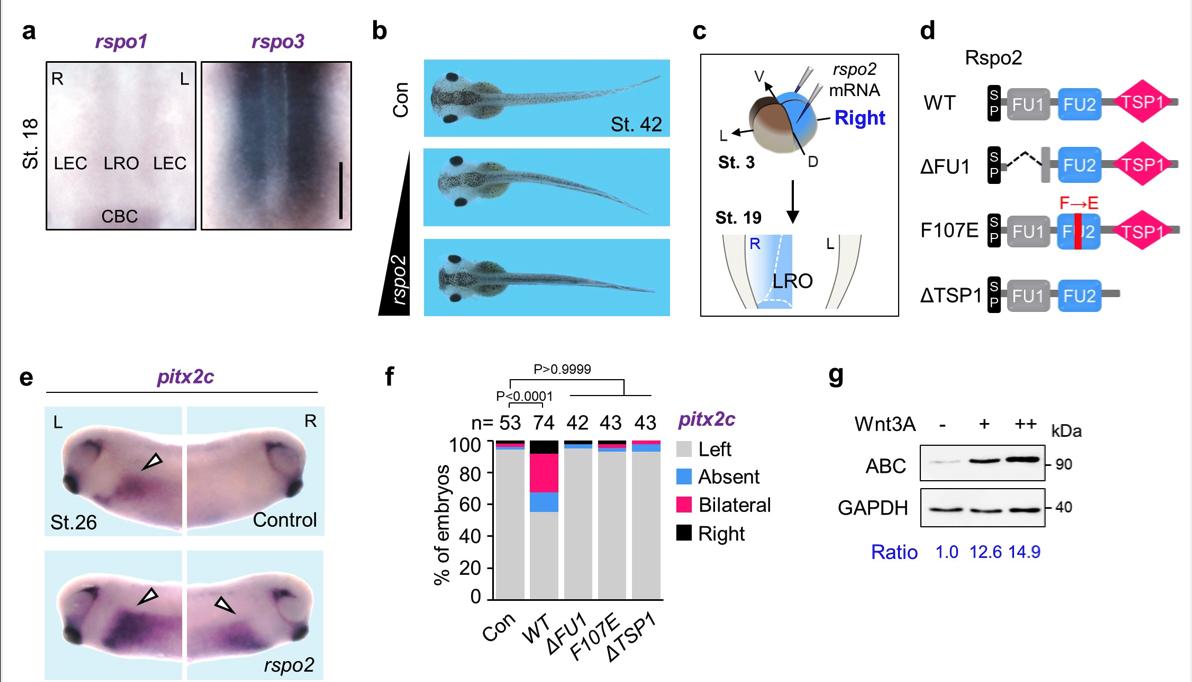 Suppl. Fig. 1 [panels a-g] Supplementary Figure 1. Rspo2 regulates LR asymmetry Wnt and BMP independently. (a) Whole-mount ni situ hybridization (WISH) of rspol and rspo3 ni the LRO (St. 18). LEC, lateral- endodermal crest; CBC, circumblastoporal collar. Scale bar, 10 um. (b) Representative images of Xenopus tailbuds (St. 42) ni Fig. 1. Note that the rspo2 mRNA dose used was below that causing gastrulation defects and embryos developed with normal body axis. (c) Microinjection strategy for (d-f). (d) Domain structures of Rspo2 wildtype (WT) and Rspo2 mutants. SP, signal peptide; FU, furin domain; TSP1, thrombospondin domain 1. (e) WISH of pitx2c ni Xenopus tailbuds (St. 26) injected as indicated. Left (L) and right (R) sides of hte same embryos are shown. Arowheads, pitx2c at the LPM. Scale bar, 05. m. (1) Quantification of pitx2c from Rspo2 and Rspo2 mutants injected embryos. (g-h) Western blot analyses in Xenopus neurulae to validate Wnt3A and DKK1 activities in Wnt signaling. Ratio, relative levels of activated -catenin (ABC) normalized ot GAPDH. |