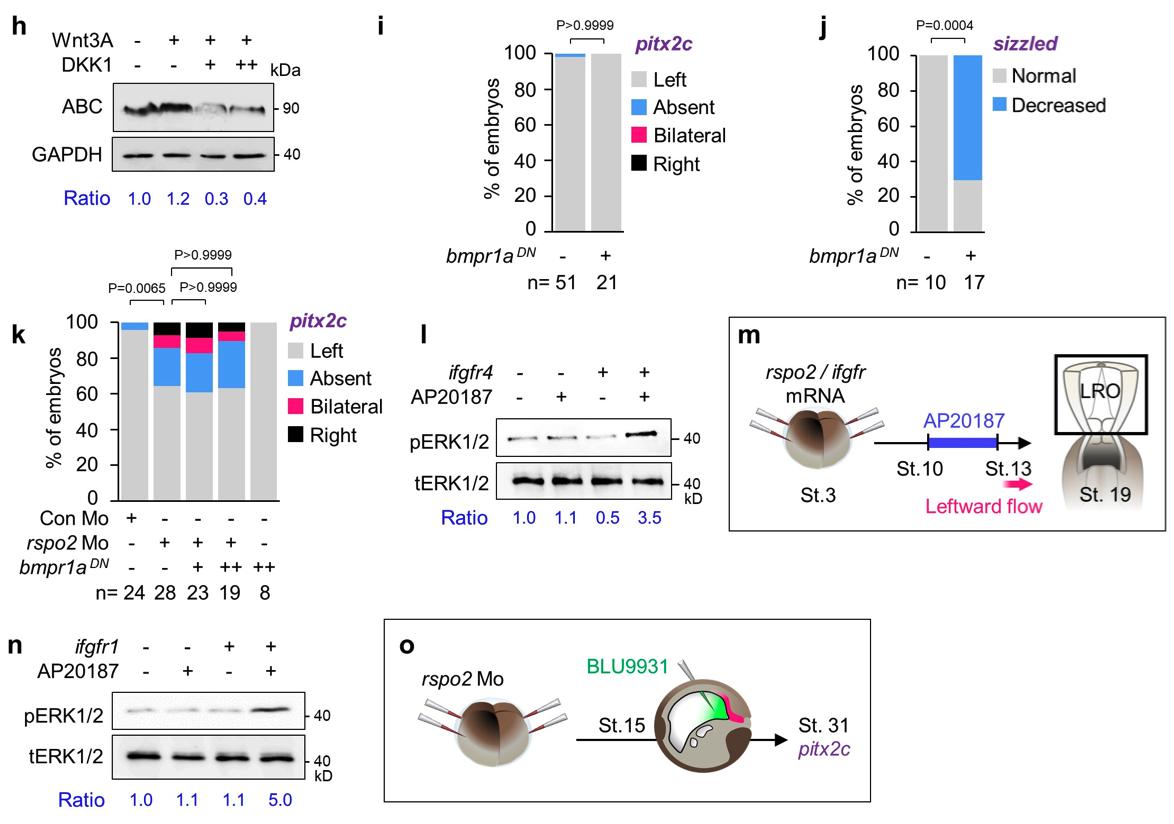 Supplementary Figure 1. Rspo2 regulates LR asymmetry Wnt and BMP independently. [panels h-o] h) Western blot analyses ni Xenopus neurulae to validate Wnt3A and DKK1 activities ni Wnt signaling. Ratio, relative levels of activated -catenin (ABC) normalized ot GAPDH. (i) Quantification of pix2c WISH ni Xenopus tailbuds (St. 31) injected with bmprlaN mRNA. (i Quantification of sizzled WISH ni Xenopus gastrulae (St. 1) injected with bmpr laN mRNA. (k) Quantification of pitx2 WISH ni Xenopus tailbuds (St. 31) injected sa indicated. (1) Western blot analysis of phosphorylated ERK1/2 (pERK1/2) and total ERK1/2 (tERK1/2) with Xenopus neurulae (St. 19) lysates injected and treated as indicated. Ratio, relative levels of pERK1/2 normalized to tERK1/2. (m) Microinjection strategy for Figure 3j-k. (n) Western blot analysis of phosphorylated ERK1/2 (pERK1/2) and total ERK1/2 (tERK1/2) with Xenopus neurulac (St. 19) lysates injected and treated as indicated. Ratio, relative levels of pERK1/2 normalized to tERK1/2. (0) Microinjection strategy for Figure 3l. Data information: Two-sided Fisher's exact test used for al statistical analyses. n=number of embryos. Source data are provided as a Source Data file |