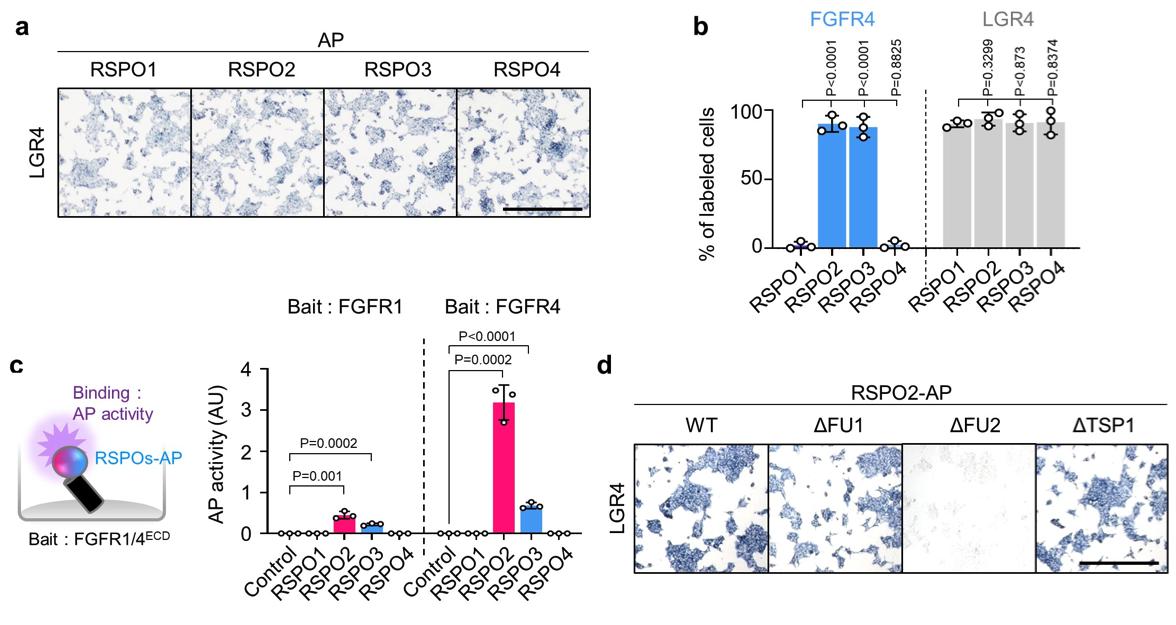 Supplementary Figure 3. RSP02 interacts with FGFR4 via the TSP1 domain. [panels a-d] (a) RSPOs cel surface binding assays ni HEK293T cels transfected with LGR4 and treated with RSPOs as indicated. Scale bar, 1mm. (b) Quantification of Figure 6b and (a). n=3 biologically independent samples. Data are displayed as means SD with two-tailed unpaired t-test. (c) (Left) Scheme of analysis. (Right) In vitro binding assay between RSPOs and FGFR1/4. n=3 experimentaly independent samples. Data are displayed as mean SD with two-tailed unpaired -t test, (d) Cel surface binding assay ni HEK293T cels transfected with LGR4 and treated with RSPOs as indicated. Scale bar, 1mm. |