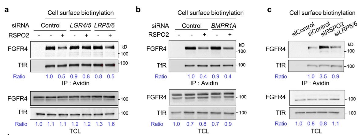 Supplementary Figure 4. RSPO2 removes cell surface FGFR4. [panels a-c] (a-b) Cell surface biotinylation assays ni HEPG2 cells treated as indicated. Transferrin receptor (TAR), a loading control. TCL, Total cel lysate. Ratio, relative levels of cel surface FGFR4 normalized to cell surface TfR. (c) Cel surface biotinylation assay ni H1581 cells upon siRNA transfection as indicated. Ratio, relative levels of cell surface FGFR4 normalized to cell surface TfR. |
