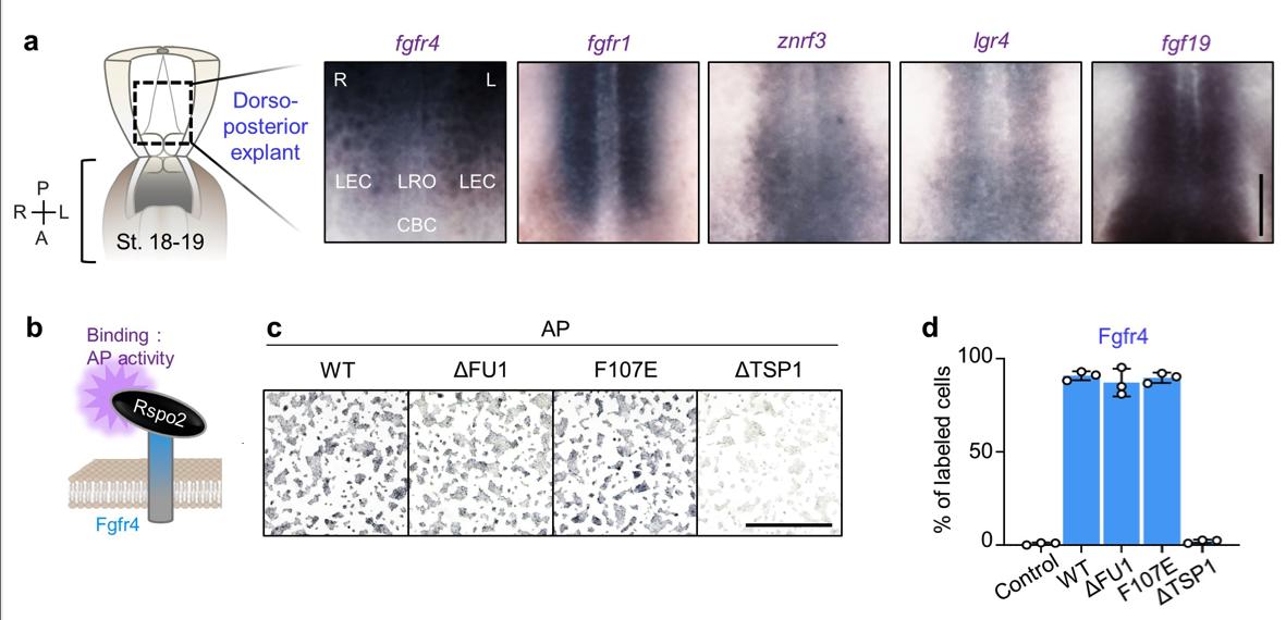 Supplementary Figure 5. Rspo2 removes cell surface Fgfr4 in Xenopus embryo. [panels a-d] (a) Whole-mount ni situ hybridization (WISH) of fgfr4, fgfr1, znrf3, Igr4, and fgf19 ni Xenopus LRO (St. 18-19). R, right; L, left. LEC, lateral-endodermal crest; CBC, circumblastoporal collar. Scale bar, 100 um. (b) Scheme of cell surface binding assay ni (c-d). (c) Cel surface binding assay ni HEK293T cels transfected with Xenopus Fgfi4 and treated with Xenopus Rspo2 wildtype and Rspo2 mutants sa indicated. Scale bar, 1mm. (d) Quantification of (c). n=3 biologically independent samples. Data are displayed as means S D . [panels a-d] |