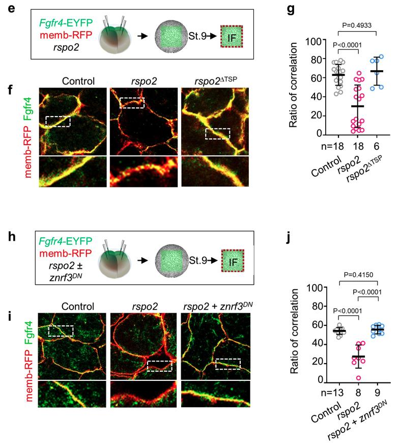 Supplementary Figure 5. Rspo2 removes cell surface Fgfr4 in Xenopus embryo. [panels e-j] (e) Scheme for immunofluorescence microscopy (IF) ni Xenopus animal cap (AC) explants ni (1). Embryos were injected animaly at S.t 3with fgfr4-EYFP and membrane (memb)-RFP mRNA along with wild-type or the TSP1 deletion mutant rspo2 mRNA. AC explants were dissected at St.9 for IF. Memb-RFP was served as acontrol ot compare reduction of Fgfi4-EYFP level at cel surface. (1) FI for Fgfr4 (green) and cel surface (red) ni AC explants injected as indicated, with a representative cel (top) and magnification (inset). Scale bar, 20 um. (g) Quantification of (t). =n number of areas analyzed. Data are displayed as mean SD with two- tailed unpaired t-test. (h) Scheme for IF ni Xenopus AC explants ni (i). Embryos were injected animally at S.t 3 as indicated and dissected at St.9 for IF. (i) FI for Egfr4 (green) and cel surface (red) ni AC explants injected as indicated, with a representative cel (top) and magnification (inset). Scale bar, 20 um. (j) Quantification of (i). =n number of areas analyzed. Data information: Data are displayed as mean SD with two-tailed unpaired t-test. Source data are provided as a Source Data file. |
