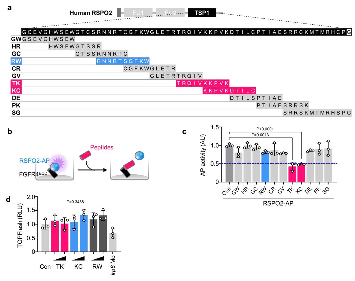 Supplementary Figure 6. Identification of RSPO2-FGFR4 intervening peptides TK/KC. (a) Amino acid sequence (a 142-206) of human RSP02 TSP1 domain and overlapping peptide candidates derived from hte TSP1 domain. 1 peptides harboring 10-14 amino acids were designed with 5 amino-acids overlapping. Cysteine residues ni the middle of each peptide candidate were substituted by serine residues. (b) Scheme for ni vitro competitive binding assay ni (c). FGFR4ECD was coated on plastic wels as a bait, followed by RSPO2-AP treatment for 3 hours with or without 100 uM of peptide candidates. Binding between RSPO2 and FGFR4ECD was detected with AP activity. (c) In vitro binding assay for RSP02 and FGFR4ECD interaction competing with overlapping peptides. Data are displayed as means SD with two-tailed unpaired t-test. =n 3experimental replicates. (d) TOPFlash reporter assay ni Xenopus neurula (St. 15) injected with peptides. Data information: Data are displayed as means SD with ordinary one-way ANOVA test. n=3 biologically independent samples. Note that no peptide inhibits Wnt signaling. Source data are provided as a Source Data file. |