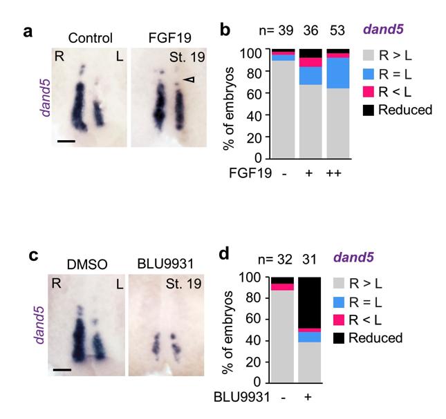 Supplementary Figure 8. FGF signaling increases dand5 expression ni the LRO. (a) WISH of dand5 ni Xenopus LRO (St. 19) injected as indicated. Arrowhead, derepression of dand5. Scale bar, 10 um. (b) Quantification of (a). =n number of dorso-posterior explants. (c) WISH of dand5 ni Xenopus LRO (St. 19) injected as indicated. Scale bar, 10 um. (d) Quantification of (c). =n number of dorso-posterior explants. Source data are provided as a Source Data file. |
