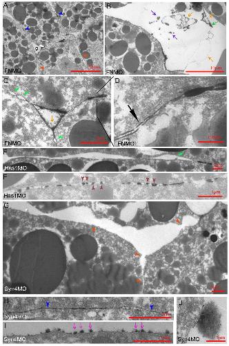 (A) LSM in ectoderm, for comparison. (BE) LSM in normal CM. (FH) C-cad morphant CM. g, interstitial gaps; y, yolk platelets; m, mitochondria; dark blue arrowheads, LSM plaques in contacts; light blue arrowheads, plaques on gap surfaces; red arrowheads, LSM-free contacts; black arrow, triple-layered contact; light green arrow, bubble; dark green arrow, shed plaque; orange arrows, lightly stained shed ribbons; purple arrows, darkly stained shed LSM.