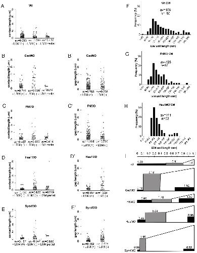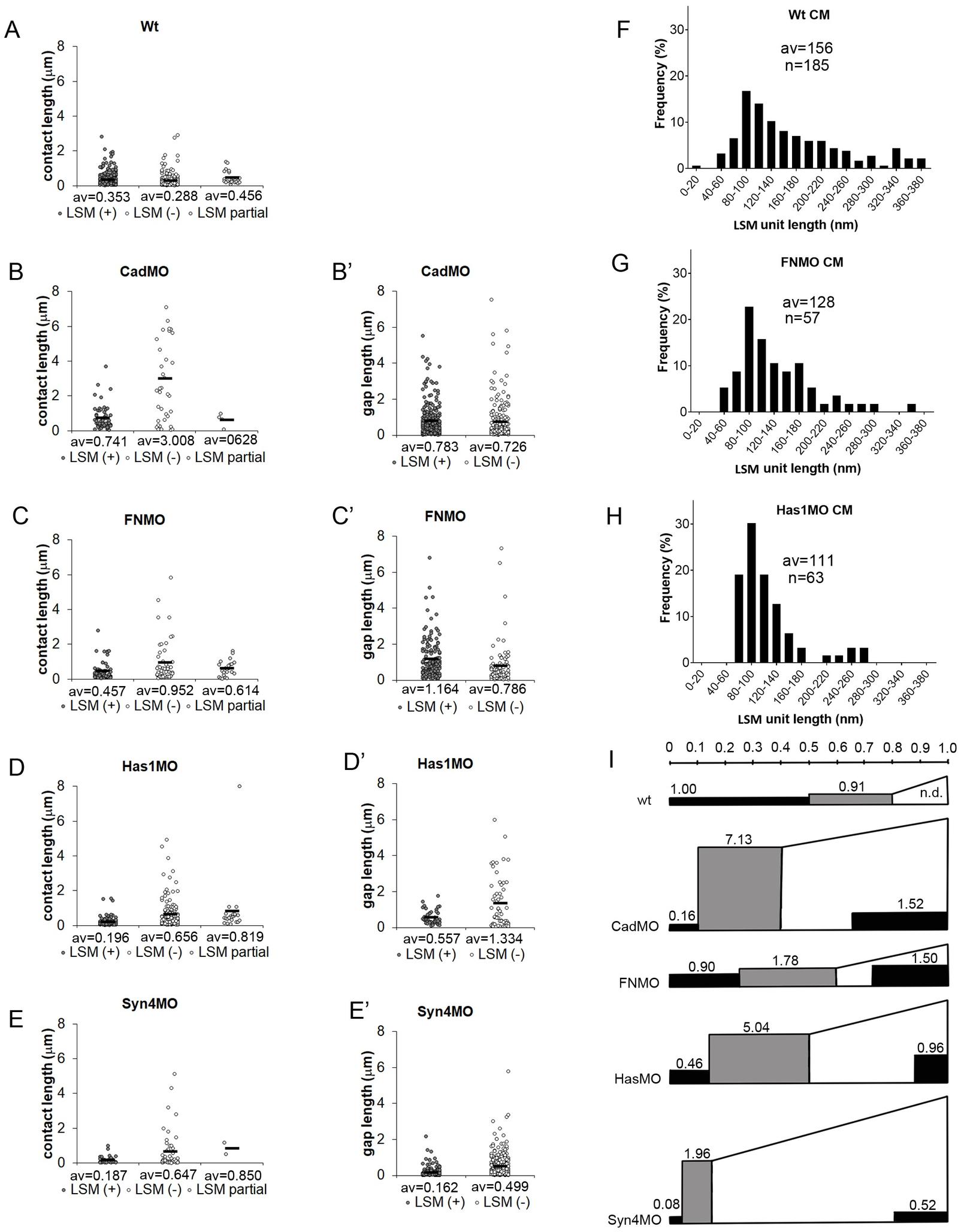 (AE) Lengths of continuous stretches of LSM-containing (LSM(+)) contacts (plaques), and of LSM-free (LSM(-)) and triple-layered (LSM partial) contacts. (BE) Lengths of continuous stretches of LSM (plaques) (LSM(+)) on gap surfaces or LSM-free surfaces (LSM(-)). Data from 4, 5, 9, 8, 6 TEM images, respectively; av., averages. (FH) Lengths of shortest LSM units discernible in normal CM contacts (F), and in contacts and gaps of morphants (G,H). n, number of unit LSM structures measured, from 4, 7, 5 TEM images, respectively. (I) Summary diagram integrating LSM (black areas) height and length data for contacts (left, rectangular) and gaps (right, wedged), and non-labeled contact height and length data for contacts (grey, rectangular). Area size relative to LSM in normal CM contacts (1.00) is indicated. Scale on top, relative average lengths of contact types. Height of rectangles, relative average widths of respective structures. Areas are proportional to respective PCM volumes.