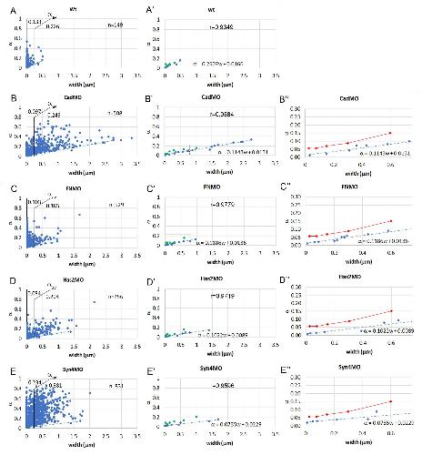 (AE) Relative adhesiveness was determined from contact angles and plotted as a function of contact width w for each gap-contact transition. The average value of , av, is indicated for w smaller or larger than 250 nm (see S1 Table). n, number of transitions measured in 26, 86, 59, 41, 80 TEM images, respectively. (AE) A linear regression line (dotted blue line) was fit to the lowest values in each plot (blue dots). The slope /w and the -axis intercept 0 of the regression line = (/w)w + 0 are indicated. r, correlation coefficient for regression line. Green dots, values for frequency peaks (see Fig 8 and S3 Table). (BE) Higher magnification of (BE) focusing on small w. frequency peak data in (BE) were pooled (red dots and lines) (see S3 Table) and compared to lower-boundary regression lines (blue).