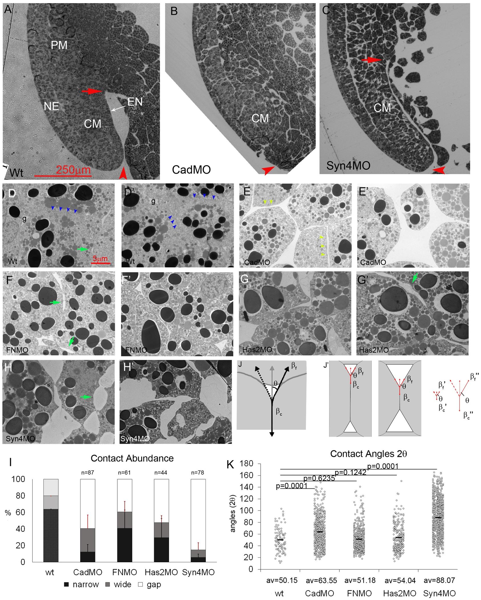 (AC) Dorsal side of normal (A) and C-cad depleted stage 11 gastrulae (B). In Syn-4 depleted embryos (C) convergent extension appears slightly accelerated in 6 out of 7 gastrulae. CM, chordamesoderm; NE, neural ectoderm; PCM, prechordal mesoderm; EN, suprablastoporal endodermal epithelium; red arrow, tip of archenteron; red arrowhead, position of blastopore. (DH) Cell packing in normal (wt) and morphant (MO) stage 11 chordamesoderm. Blue arrowheads, narrow contacts between cells; green arrows, two-sided gaps (bubbles) between two cells; light green arrowheads, wide contacts between cells; g, gaps at 3- or 4-cell junctions. (I) Abundances of narrow (< 50 nm) and wide (> 50 nm) contacts, and interstitial gaps. Bars, standard deviations. (wt) is from Barua et al. [4]. n, number of TEM images analyzed. (J) Tensions at 3-sided gap. For tension f at free gap surface to balance tension per cell c at contact interface it must act at a contact angle . (J) Same contact angle and thus relative adhesiveness can combine with large (left) or small (middle) contacts (small or large gaps, respectively). Same can be generated by smaller ( and ) or larger ( and ) tensions, provided that their ratio is retained. (K) Each dot represents a measured angle 2 in normal and morphant CM; av., average.