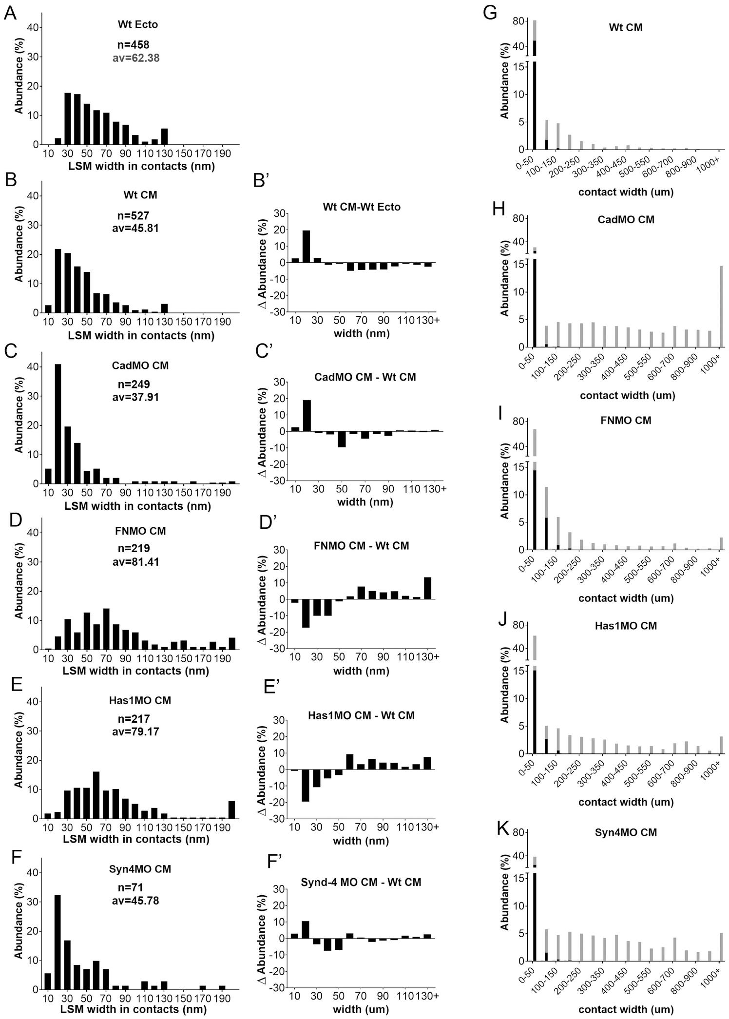 (AF) Width frequency distributions in ectoderm (A) for comparison, in CM (B) and in various CM morphants (CF). n, number of width measurements from 18, 4, 6, 8, 3 TEM images, respectively; av., average. (BF) Corresponding difference (Abundance) spectra comparing width distributions of CM to ectoderm (B), and of morphants to normal CM (CF). (GK) Comparison of widths of LSM-containing (black parts of bars) and LSM-free (grey parts of bars) contacts, using the data from (BF) and S1 Fig.