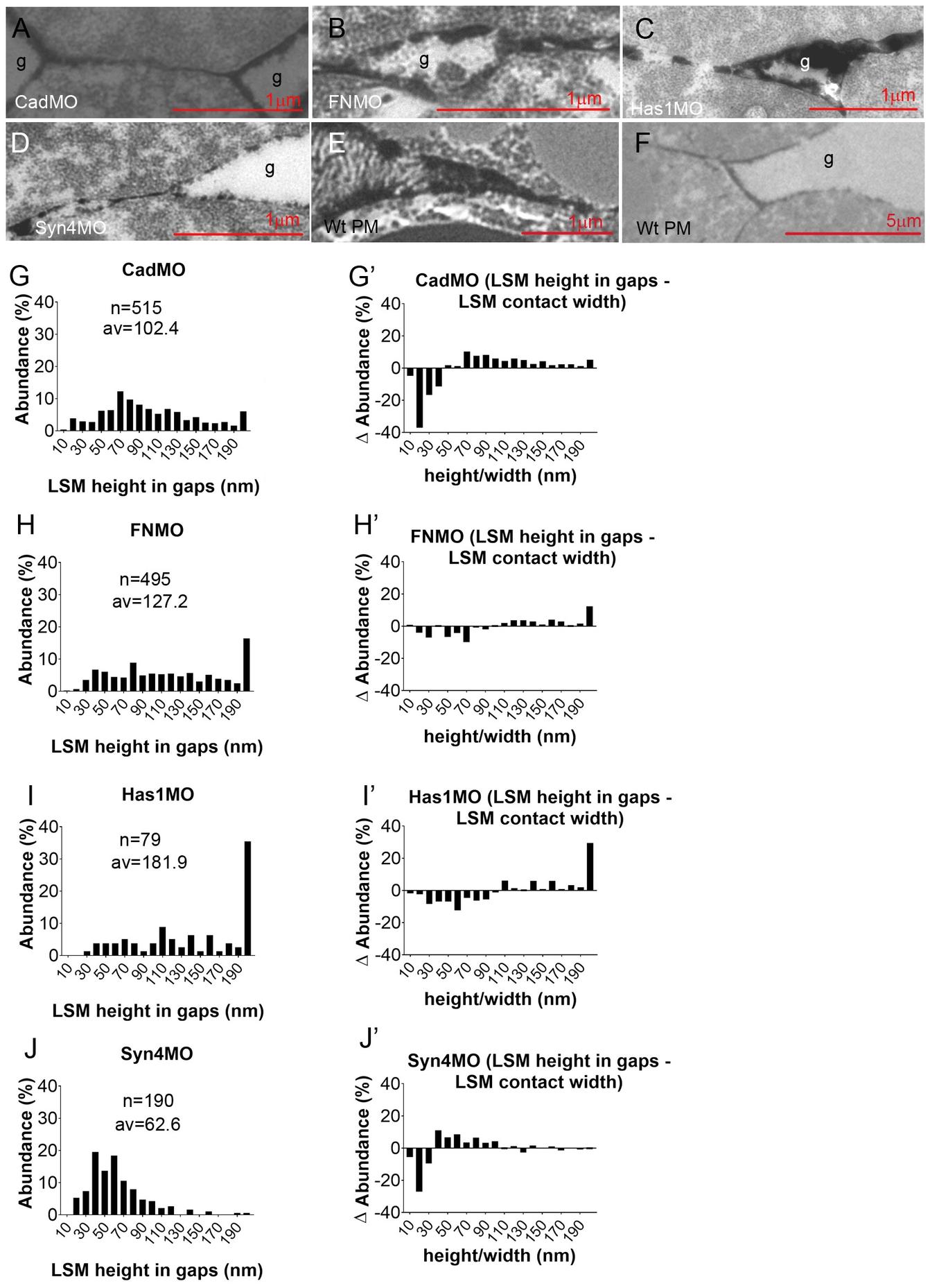 (AF) Examples of LSM at transitions from gaps (g) to cell-cell contacts. PM, prechordal mesoderm. (GJ) Frequency distributions of LSM height in gaps (corresponding to LSM width in contacts). n, number of measurements from 5, 6, 3, 7 TEM images, respectively; av., average. (GJ) Difference (Abundance) spectra corresponding to (GJ), comparing LSM height in gaps to LSM width in contacts.