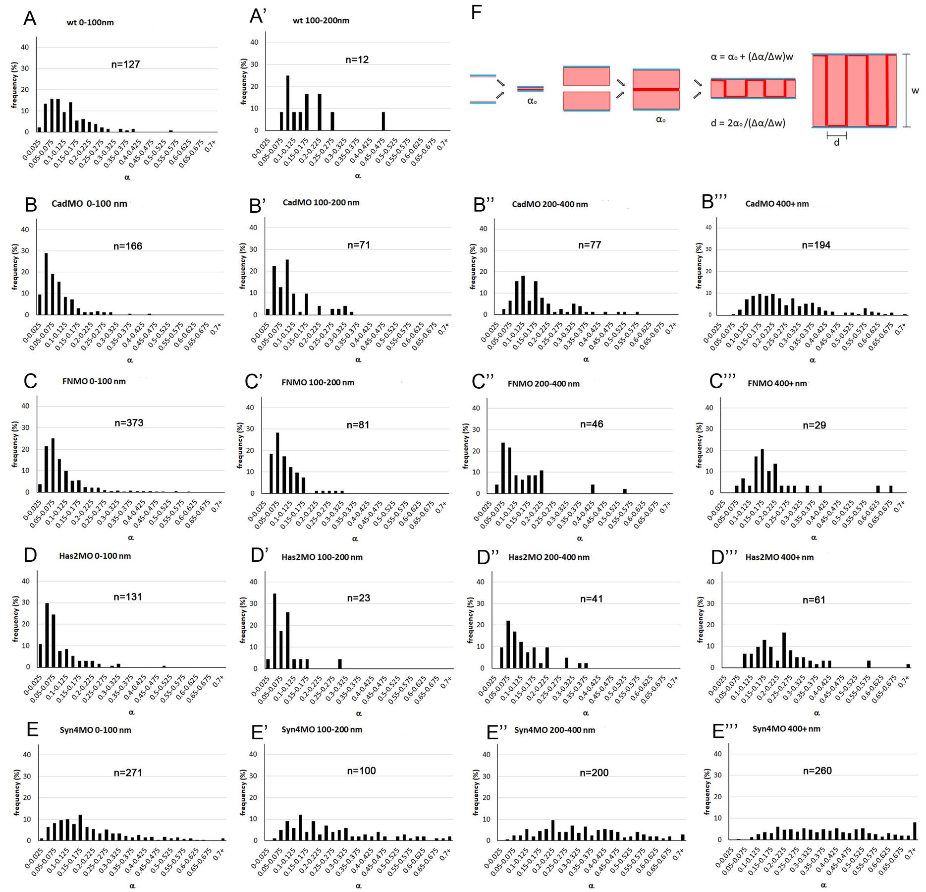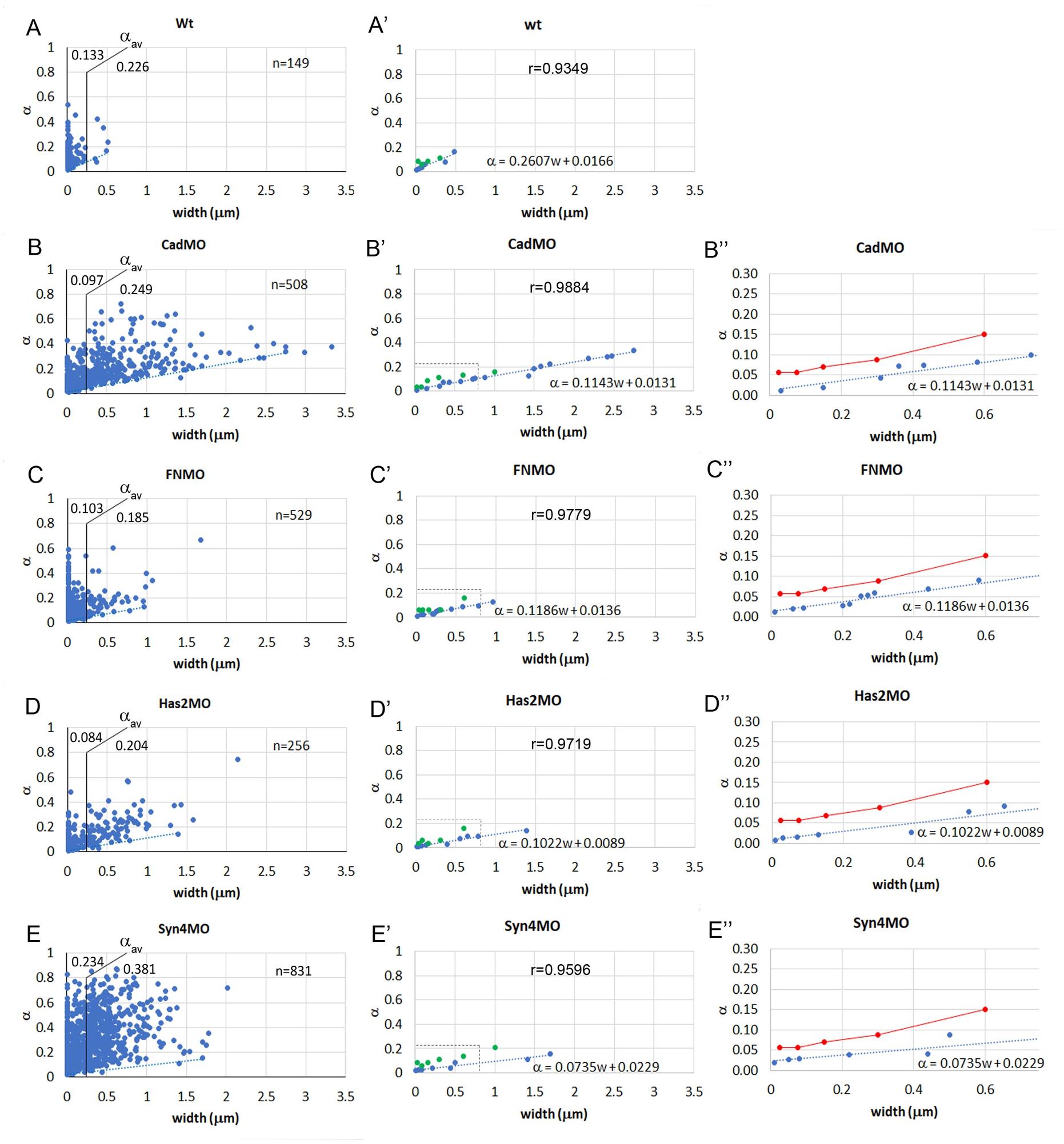 (A-E’’’) Different treatments are arranged vertically and width brackets horizontally, as indicated on top of each diagram. n, number of α-w data points. Additional width brackets are shown in S3 Fig (F) Model of cell-cell adhesion by PCM interdigitation. Adhesion between two thin or thick PCM layers (light red) on cell membranes (blue) occurs in principle through a narrow interaction zone (deep red), yielding in each case the basic adhesiveness α0 (left). Interdigitation of the two apposed PCMs corresponds to a folding of the interaction surface which increases linearly with PCM height w at constant interdigitation distance d (right).