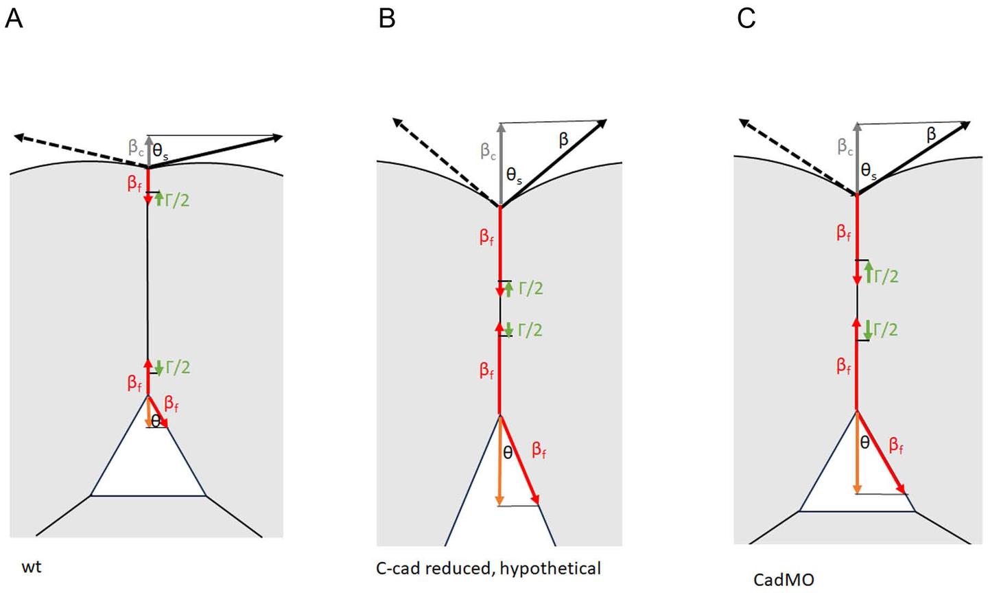 (A) In normal CM, cortical tension β at the tissue surface (black) is strongly reduced upon cell adhesion to tension βf (red). Release of binding energy due to adhesion factor interactions at the narrow CM contacts generates an adhesion tension Γ/2 (green). Tensions βf and Γ/2 balance the resultant tension βc (grey); surface contact angle, θs. The same tensions βf and Γ/2 act at the transition to interstitial gaps, but at the gap surface not β but the much smaller βf balance these tensions (orange), requiring a much smaller contact angle θ. (B) In C-cad morphants, tension β at the free surface remains; at contacts tension it is much less diminished. In the width range of normal CM, Γ/2 may remain the same, contact angle θ becomes smaller, and the relative adhesiveness α appears reduced. (C) When the average Γ/2 is increased with contact width much beyond the normal CM range, the contact angle θ at gaps can remain the same or even increase while a lowered angle θs at the surface still indicates the reduced overall adhesion strength (the difference σ = β − βc) due to C-cad depletion.