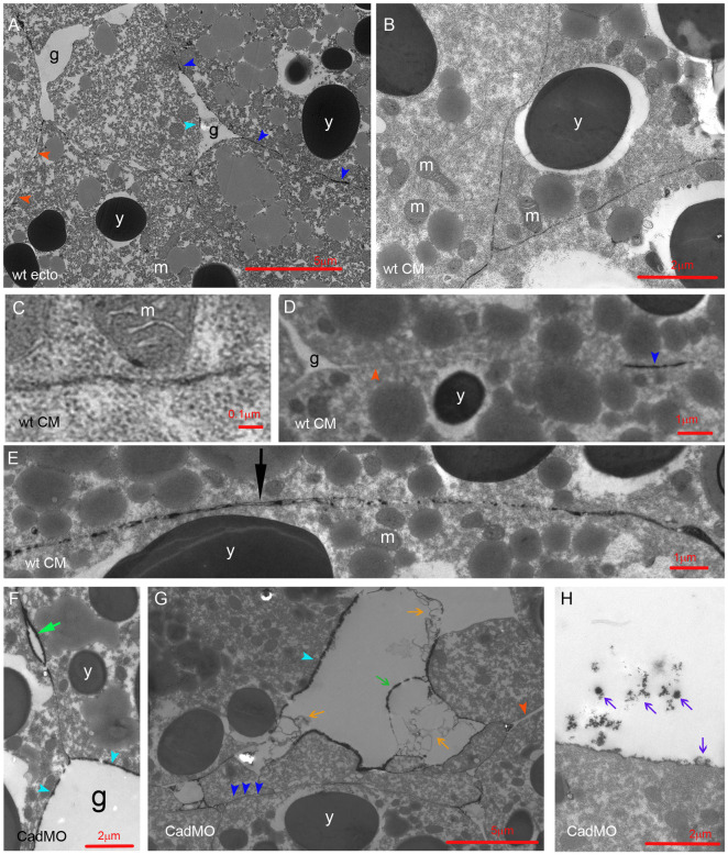 Fig 2. LSM in normal and C-cad depleted CM.(A) LSM in ectoderm, for comparison. (B–E) LSM in normal CM. (F–H) C-cad morphant CM. g, interstitial gaps; y, yolk platelets; m, mitochondria; dark blue arrowheads, LSM plaques in contacts; light blue arrowheads, plaques on gap surfaces; red arrowheads, LSM-free contacts; black arrow, triple-layered contact; light green arrow, bubble; dark green arrow, shed plaque; orange arrows, lightly stained shed ribbons; purple arrows, darkly stained shed LSM.
