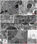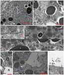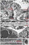 Dark red arrowheads, semi-drop-like LSM sitting on upper or lower membrane; dark blue arrowheads, LSM plaques in contacts; light blue arrowheads, plaques on gap surfaces; red arrowheads, LSM-free contacts; black arrow, triple-layered contact; light green arrow, bubble; dark green arrow, shed plaque; orange arrows, lightly stained shed ribbons; purple arrows, darkly stained shed LSM; magenta arrows, LSM dots.