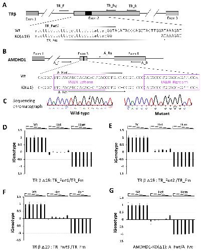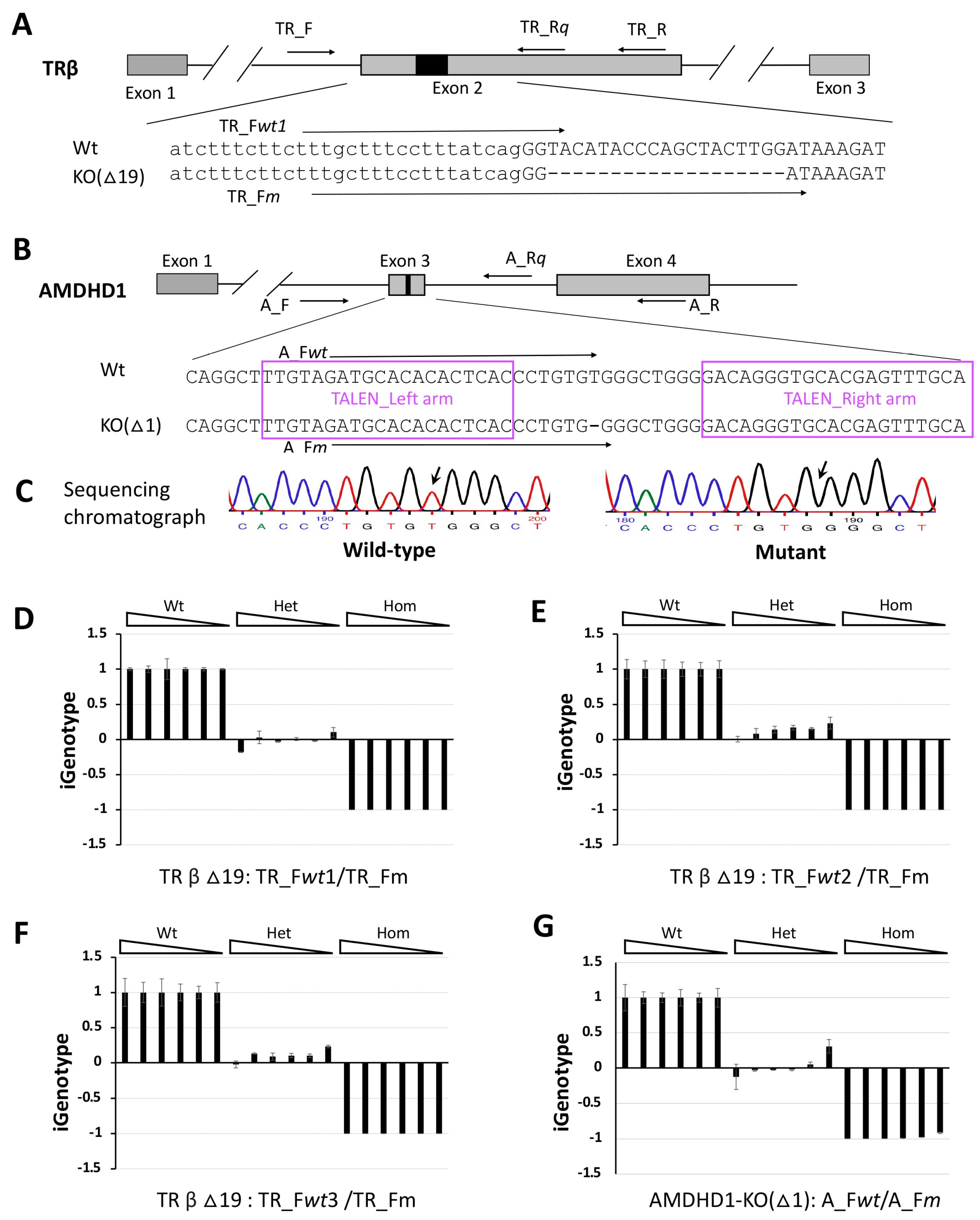 Figure 3. iGenotype indexes are highly reproducible and reliable for genotyping with different mutation targets in a wide range of genomic DNA concentrations. (A): Schematic diagram showing wild-type (Wt) X. tropicalis TRβ or a mutant with a 19-nucleotide deletion (TRβ∆19) and primers (TR_F, TR_Rq, TR_R, TR_Fwt1, and TR_Fm) used in the parallel qPCR analysis to determine iGenotype indexes. (B): Schematic diagram showing wild-type (Wt) X. tropicalis AMDHD1 or a mutant with a single-nucleotide deletion (AMDHD1-KO(∆1)), which was generated through TALEN-mediated genome editing, and primers (A_F, A_Rq, A_R, A_Fwt, and A_Fm) used in the parallel qPCR analysis to determine iGenotype indexes. The TALEN-targeted regions were boxed and marked with TALEN_Left arm or TALEN_Right arm. (C): Sequencing chromatographs showing the wild-type (Wild-type) and AMDHD1-KO(∆1) mutant (Mutant) sequences around the single-nucleotide deletion (indicated by arrows). (D–F): The target regions of TRβ∆19 tadpoles were amplified by PCR with primers TR_F and TR_R, purified and serially diluted at 1:5 to serve as templates in the parallel qPCR analyses to determine the iGenotype indexes. The parallel qPCR reactions were performed in triplets with reverse primer TR_Rq paired with either TRβ∆19-specific primer TR_Fm for the mutant allele or in parallel with different wild-type-specific primer TR_Fwt1 (D), TR_Fwt2 (E), and TR_Fwt3 (F) for the wild-type allele, respectively. (G) The target regions of AMDHD1 targets were amplified by PCR with primers A_F and A_R, purified and serially diluted at 1:5 to serve as templates in the parallel qPCR analyses, which were performed in triplets with reverse primer A_Rq paired with either AMDHD1-KO(∆1)-specific primer A_Fm for the mutant allele or in parallel with the wild-type-specific primer A_Fwt, to determine the iGenotype indexes. The iGenotype indexes were plotted as mean ± standard deviation. E: exon; -: deletion; Wt: wild type; Het: heterozygous mutant; Hom: homozygous mutant; Cells 13 00247 i001: DNA concentration gradient.