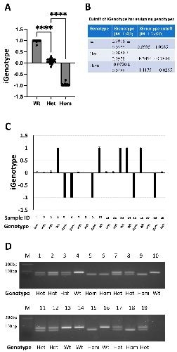 Figure 4. Genotyping animals with iGenotype indexes. The genotype-associated iGenotype indexes obtained from different combinations of primer sets in parallel qPCR reactions on different concentrations of MBD3-KO(∆8), TRβ∆19, and AMDHD1-KO(∆1) targets (Supplemental Data S1), respectively, were pooled together for statistical analysis with one-way ANOVA analysis (A) and used to establish the iGenotype index cutoff ranges for determining genotypes of unknown animals (B). To test the utilization of iGenotype index cutoff ranges for genotyping unknown animals, we mated heterozygous animals carrying the TRβ∆19 mutation. Genomic DNA was isolated from individual tadpoles for parallel qPCR reactions with TR-Rq paired with TRβ∆19-specific primer TR_Fm for the mutant allele and wild-type-specific TR_Fwt1, respectively, on 19 individual samples (C). The DNA was also used for genotyping with regular PCR with TR_Fa and TR_Ra (Table 1) for comparison (D), where the PCR products were resolved on a 3.5% agarose gel and photographed. The wild-type and mutant alleles had different sizes of PCR products and thus can be easily identified on the gene. Note that the genotypes identified based on iGenotype index cutoffs were all consistent with that from regular PCR genotyping. Wt: wild type; Het: heterozygous mutant; Hom: homozygous mutant; M: DNA marker. **** p < 0.001.