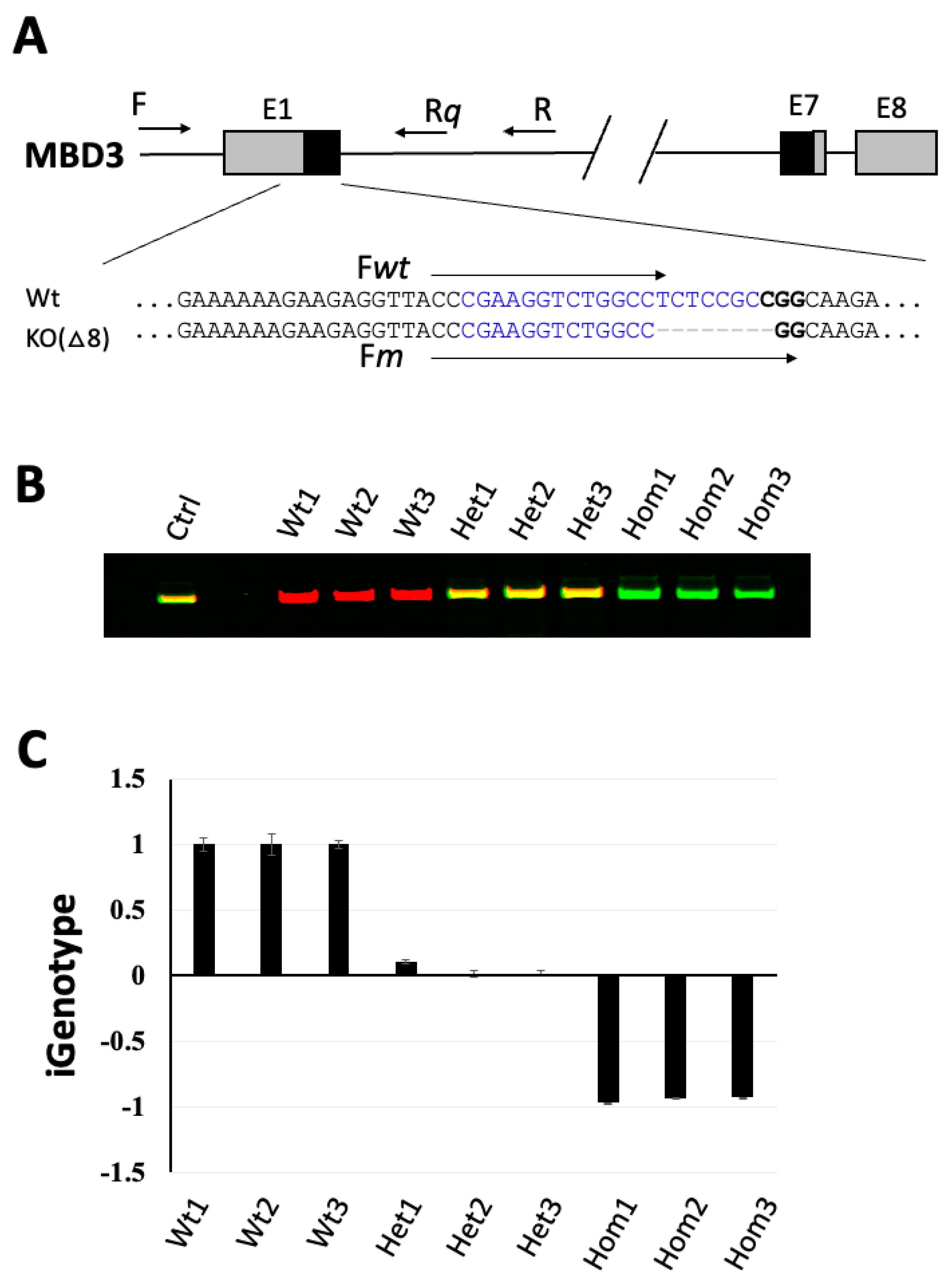 Figure 1. Comparison of qPCR-based iGenotype indexes for genotyping with the competitive PCR assay with dual fluorescent primers. Schematic illustration (A) showing wild-type and mutant X. tropicalis MBD3 gene with an 8-nucleotide deletion (MBD3-KO(∆8)) and primers used in the parallel qPCR analysis to determine iGenotype indexes (Table 1). Genomic DNA from three animals of each genotype, i.e., the wild-type (Wt), heterozygous (Het), and homozygous (Hom) mutants, respectively, was subjected to the competitive PCR assay with dual fluorescent primers [28] (B) or qPCR-based iGenotype index analyses (C) for genotyping. Parallel qPCR reactions were performed in triplets, and the iGenotype indexes were plotted with mean ± standard deviations. Note that iGenotype indexes were converged to approximately +1, 0, and −1, respectively, for the wild-type, heterozygous, and homozygous mutants, respectively. E: exons; Ctrl: heterozygous control; F, Rq, R, Fwt and Fm: primers (Table 1). Wt: wild type; Het: heterozygous mutant; Hom: homozygous mutant.