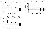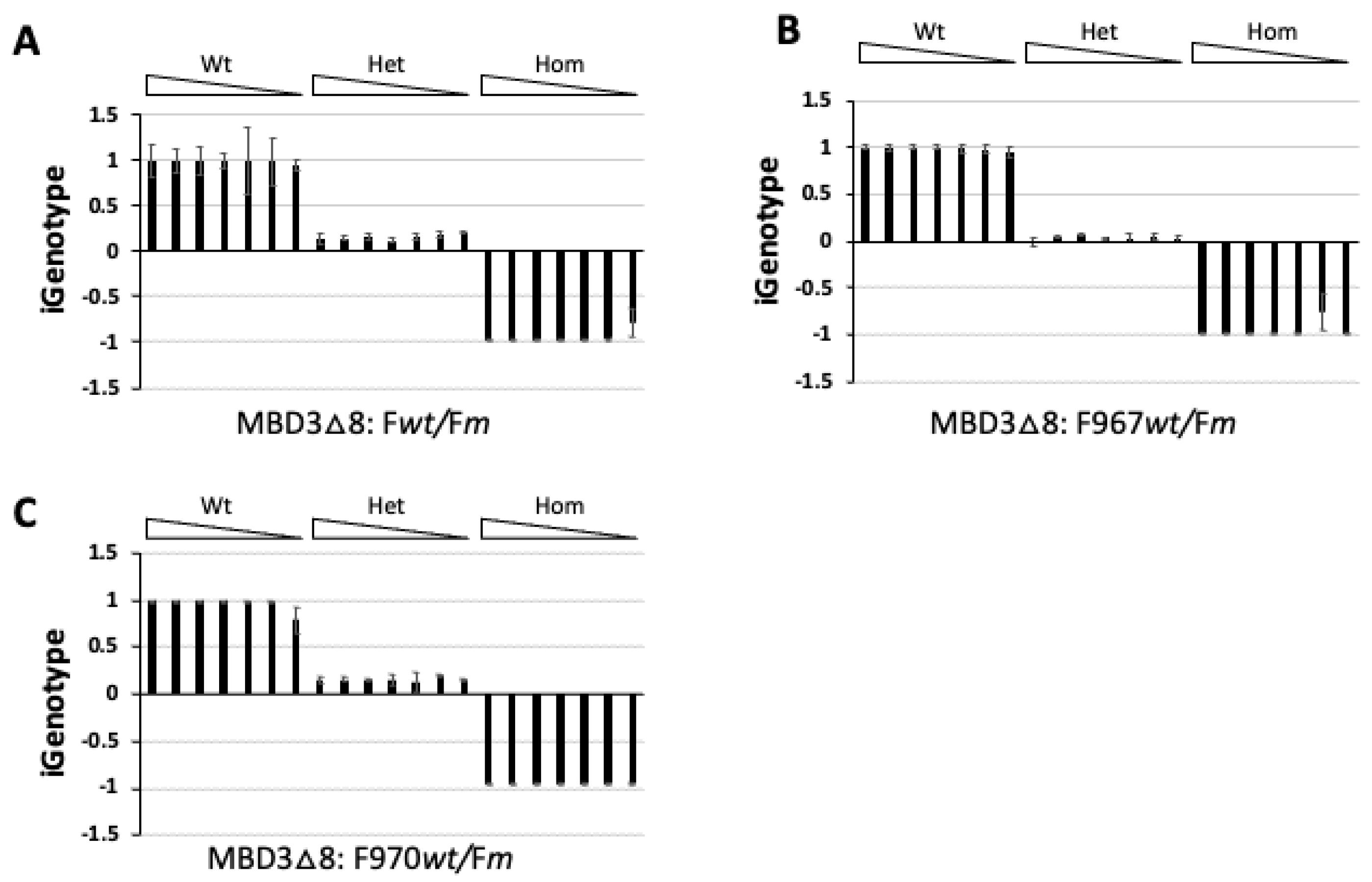 Figure 2. iGenotype indexes are highly reproducible and reliable for genotyping different allele-specific primer sets in parallel qPCR in a wide range of genomic DNA concentrations of MBD3-KO(∆8) tadpoles. The target regions of MBD3-KO(∆8) tadpoles were amplified by PCR with primers F and R (Figure 1A), purified and serially diluted at 1:5 to serve as templates in parallel qPCR analyses to determine the iGenotype indexes. The parallel qPCR reactions were performed in triplets with reverse primer Rq paired with either the MBD3-KO(∆8)-specific primer Fm for the mutant allele or in parallel with different wild-type-specific primer Fwt (A), F967wt (B), and F970wt (C) for the wild-type allele, respectively. The iGenotype indexes were plotted as mean ± standard deviation. Wt: wild type; Het: heterozygous mutant; Hom: homozygous mutant, Cells 13 00247 i001: DNA concentration gradient.