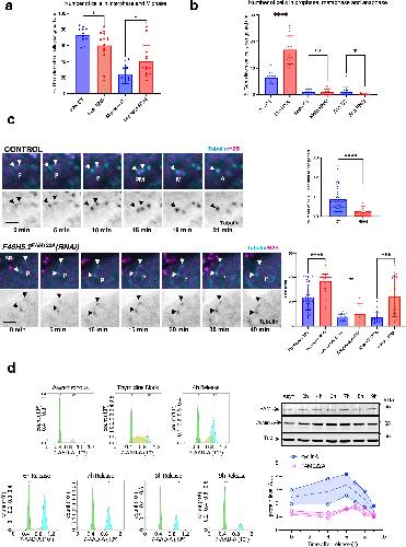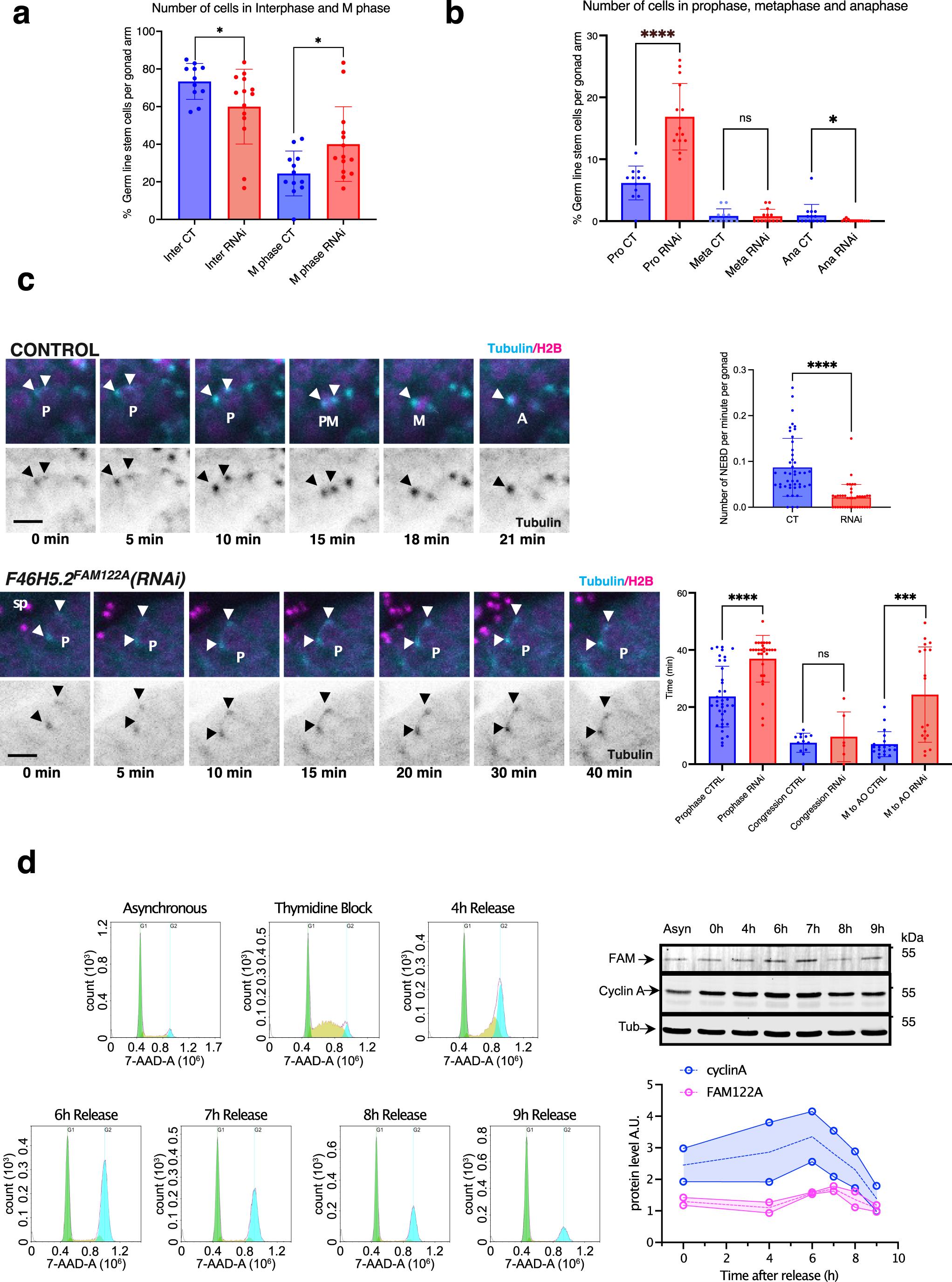 (A) Nematode strains expressing histone and gamma-tubulin tagged with GFP were immobilised and immediately imaged by confocal microscopy for the quantification of interphase and mitotic cells as reported in the scheme of Appendix Fig. S6. Data are represented as mean ± standard deviation. (B) Prophase, metaphase and anaphase germ stem cells in gonads of worms were counted as in (A) and represented as mean ± standard deviation. (C) A GFP-tagged tubulin and with RFP-tagged histone nematode strain was followed by time lapse confocal microscopy and the timing of mitotic progression was determined in germ stem cells. Shown are representative images of stem cells performing mitotic division over time in control and RNAi treated worms. The number of cells performing nuclear envelope breakdown (NEBD) per minute and per gonad were counted and represented as the mean values ± standard deviation. Timing of cells to perform prophase (from first centrosome movement to nuclear envelope breakdown), congression (from nuclear envelope breakdown to metaphase plate) or anaphase onset were also recorded and represented as mean values ± standard deviation. Significant differences calculated by non-parametric two tailed Mann–Whitney test are shown. Arrowheads: centrosomes. P:prophase. Sp: Spermatozoids. PM: prometaphase. A: anaphase. Scale bar: 10 μm. *p < 0.01; ***p < 0.001; ****p < 0.0001. n ≥ 10. (D) RPE1 cells were (Thymidine Block) or not (Asynchronous) synchronized with thymidine treatment and released at the indicated timepoints. Released cells were used for western blot to measure FAM122A, cyclin A and tubulin levels at the different timepoints. Western blot signals were measured and FAM122A and cyclin A amounts were normalized and represented. n = 2. Source data are available online for this figure.