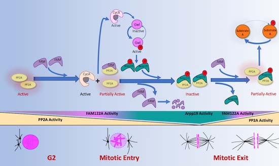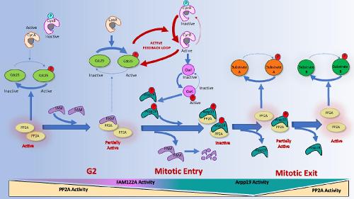 Figure 2. FAM122A triggers mitotic entry by inhibiting PP2A-B55 and permitting cyclin A/Cdk-dependent phosphorylation of mitotic substrates.
