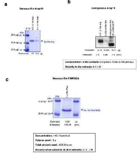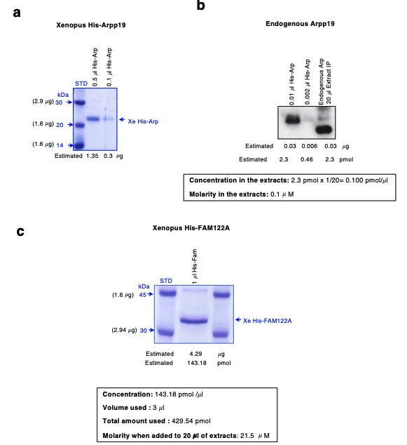 Xe-His-Arpp19. (c) Xenopus His-FAM122A concentration was estimated as for (a) and the final molarity corresponding to