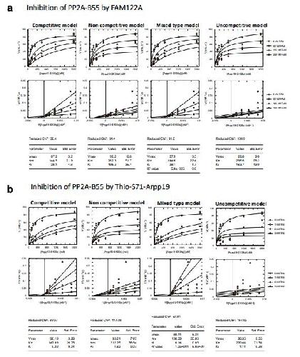 by FAM122A. The inhibition of PP2A-B55 by FAM122A was fitted using 4 different inhibition models: competitive of pS113-Arpp19, non-competitive, mixed or uncompetitive. Lineweaver-Burk representations, reduced Chi2 values and the