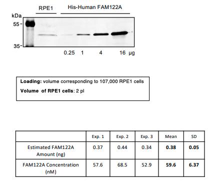 107,000 RPE1 cells was loaded, together with 0.25, 1, 4 and 16 µg of His-Human FAM122A in a SDS-PAGE gel
