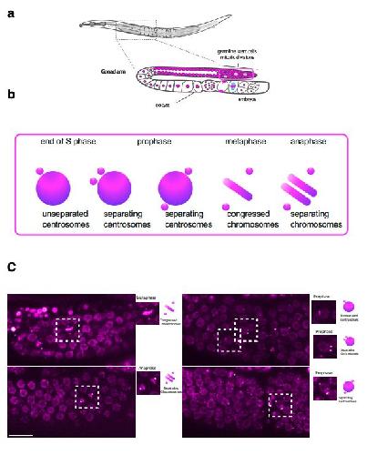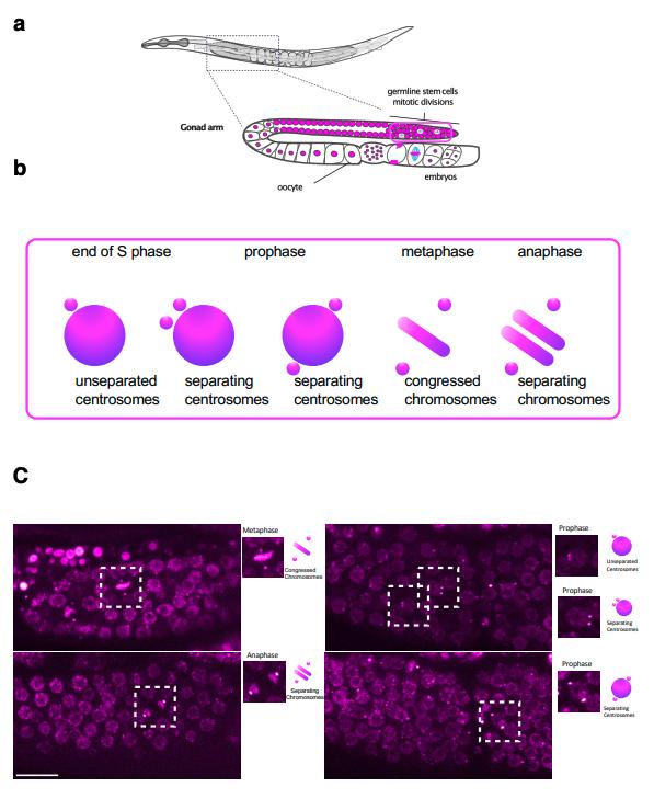 distal part of each gonad arm. Chromatin is represented in magenta, microtubules in cyan (b) Schematic representation of
