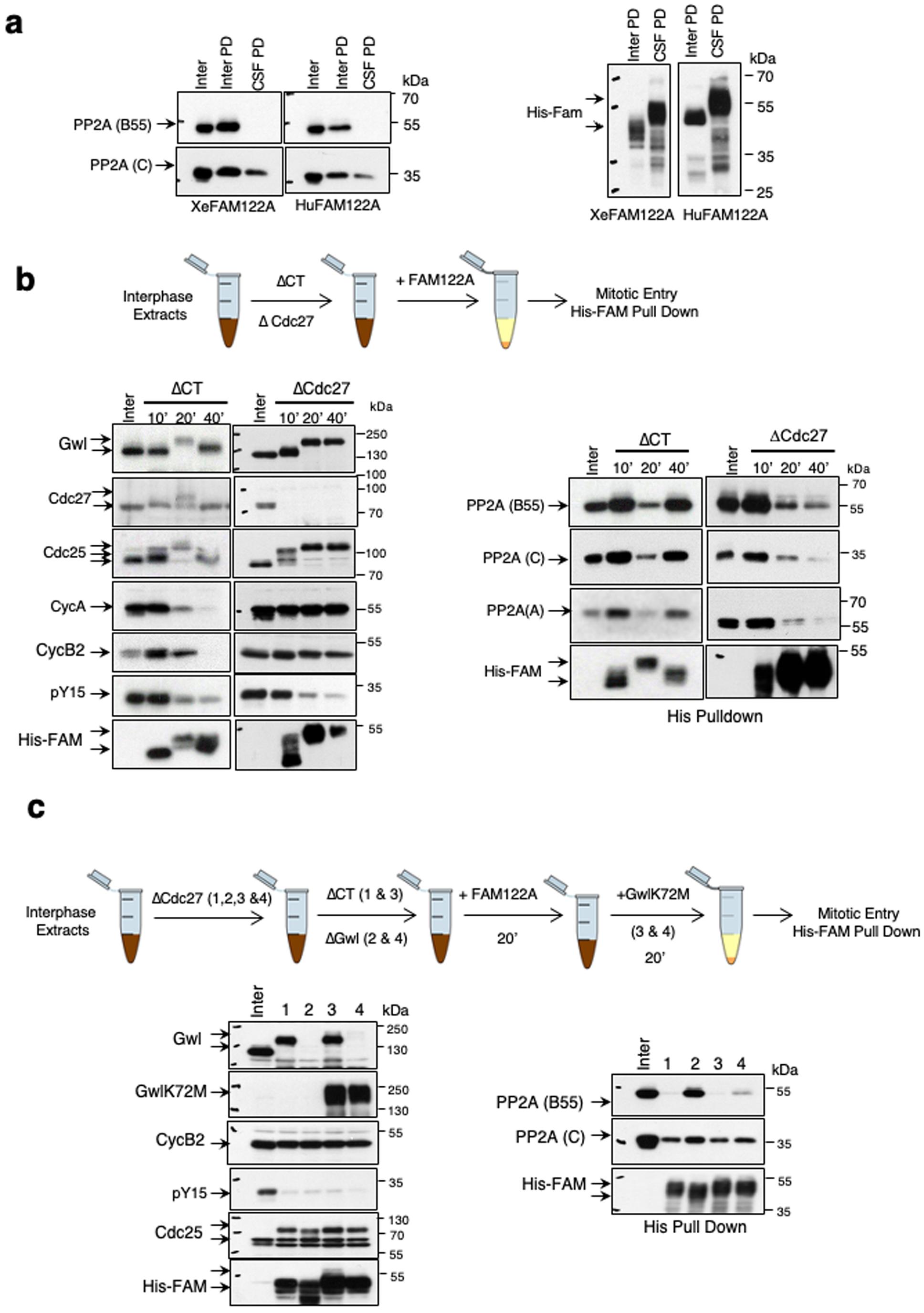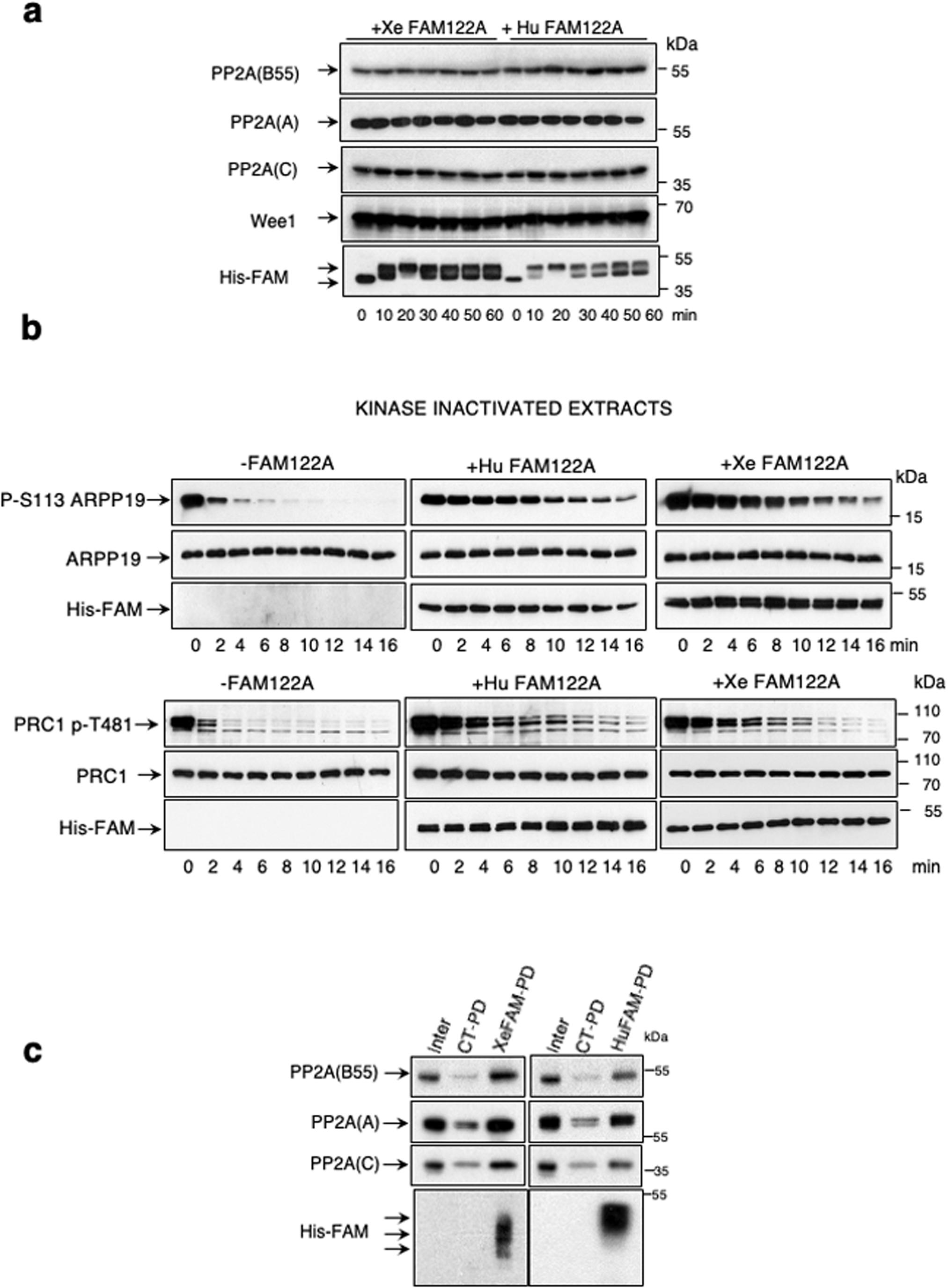 Figure 1. PP2A-B55 inhibition by FAM122A does not involve changes in PP2A-C or Wee1 levels.