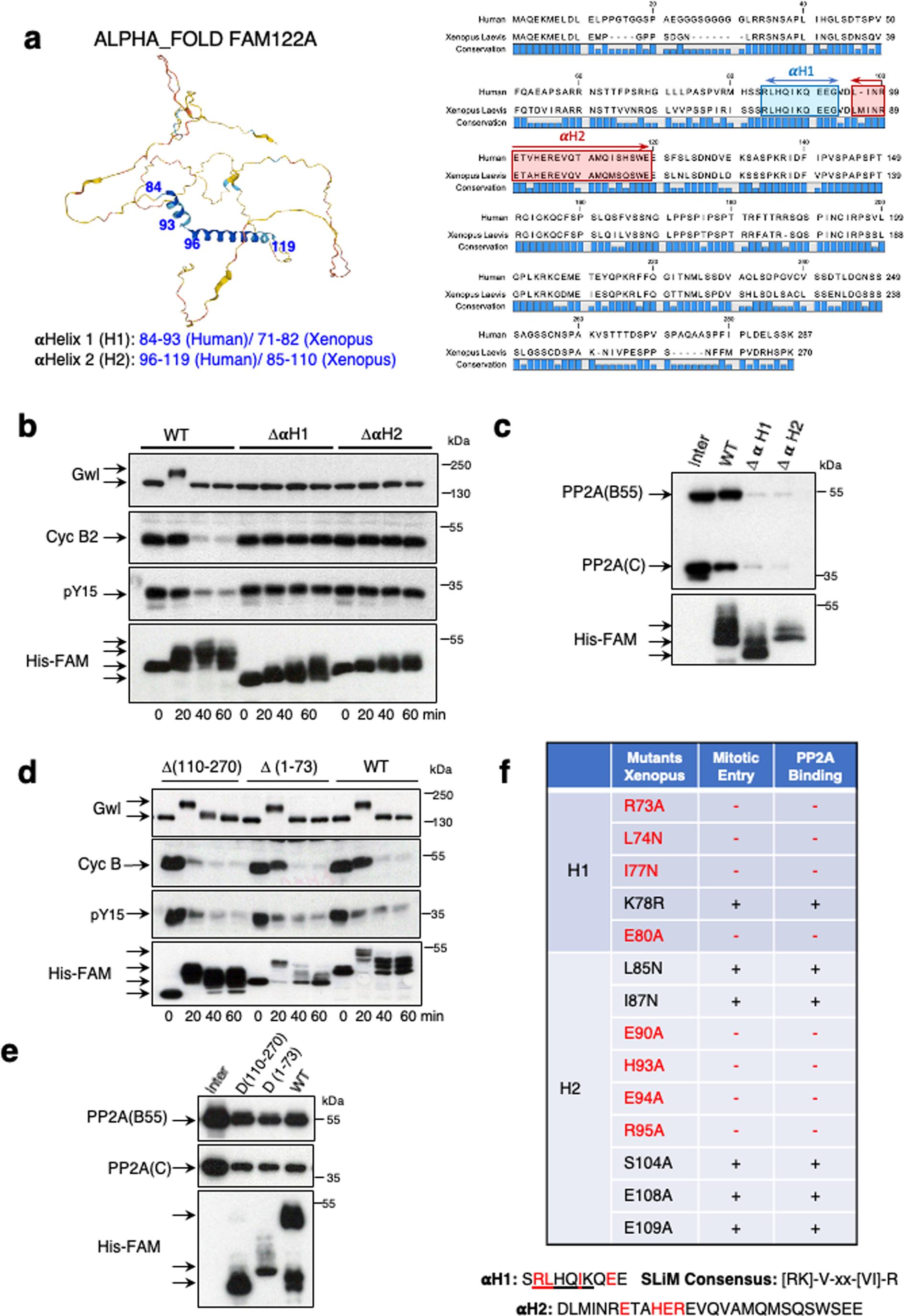 (A) AlphaFold Monomer v2.0 predicts two structured αhelices (αHelix 1 and αHelix 2) in the human FAM122A protein and human. Xenopus laevis amino acid sequence alignment. αHelix 1 and αHelix 2 are indicated. (B) Interphase extracts were supplemented with the wildtype or the αH1 or αH2 mutants of Xe FAM122A and the phosphorylation and levels of the indicated proteins measured at the indicated times. (C) Interphase extracts supplemented with wildtype and αH1 or αH2 mutants were used for His-pulldown to measure the association of these proteins to B55 and C subunits of PP2A-B55. (D) The wildtype and the indicated mutant forms of Xe FAM122A were supplemented to interphase extracts and used for western blot. (E) His-pulldown was performed in extracts treated as in (D) to check the binding of the different forms of Xe FAM122A form to B55 and C. (F) Table indicating the capacity of the different single mutants of Xe FAM122A to induce mitotic entry and to bind to PP2A-B55. Mutants that have lost their inhibitory activity are depicted in red. The sequence of the αH1, the SLiM consensus sequence and the sequence of αH2 are shown. Residues essential to keep the inhibitory activity of Xe FAM122A are highlighted in red. Source data are available online for this figure.