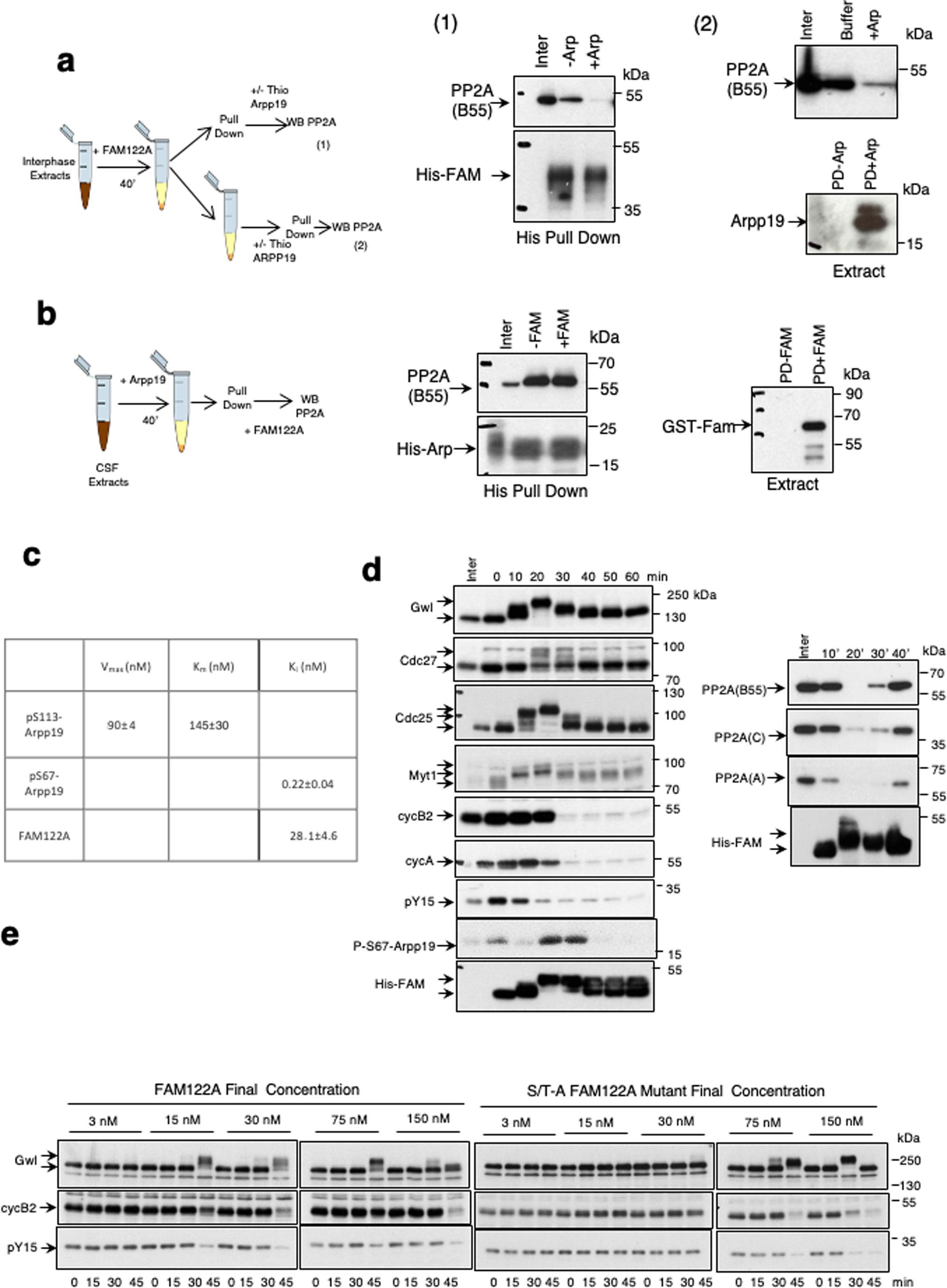 (A) Interphase extracts were supplemented with a final concentration of 7.15 μM of Xe FAM122A and 40 min later divided into two samples. One of these samples was used to perform a His-pulldown that was then supplemented with a final concentration of 2.7 μM of untagged Thio-Arpp19 protein and used to measure bound B55 protein. The second sample was firstly supplemented with untagged 69.3 pmol of Thio-Arpp19 and subsequently used for His-pulldown to measure His-Xe FAM122A bound B55 subunit of PP2A. A sample of the His-Xe FAM122A pull downs supplemented (PD+Arp) or not (PD-Arp) with untagged Thio-Arpp19 is shown. (B) CSF extracts were supplemented with a final concentration of 3,6 μM His-Arpp19 and, 40 min later, used for His-pulldown. Arpp19-pull downs were then supplemented with a final concentration of 10 μM GST-Xe FAM122A and the levels of B55 remaining were measured. A sample of the His-Arpp19 pull downs supplemented (PD + FAM) or not (PD-FAM) is shown. (C) Table indicating the kinetic parameters of the dephosphorylation of the PP2A-B55 substrate p-S113-Arpp19 and the inhibitory constant of FAM122A and Thio-S71-Arpp19 in kinase inactivated interphase extracts. Conditions used in these assays are detailed in Methods. (D) Interphase extracts were supplemented with His-Xe FAM122A and used for either western blot to measure the levels and the phosphorylation of the indicated proteins and or for His-pulldown determine Xe FAM122A binding to PP2A B55, A and C subunits at the indicated time points. (E) Interphase extracts were supplemented with His-FAM122A to the indicated final concentrations and mitotic entry was assessed by the phosphorylation of Gwl, dephosphorylation of tyrosine 15 of Cdk1 and the degradation of cyclin B2. Source data are available online for this figure.