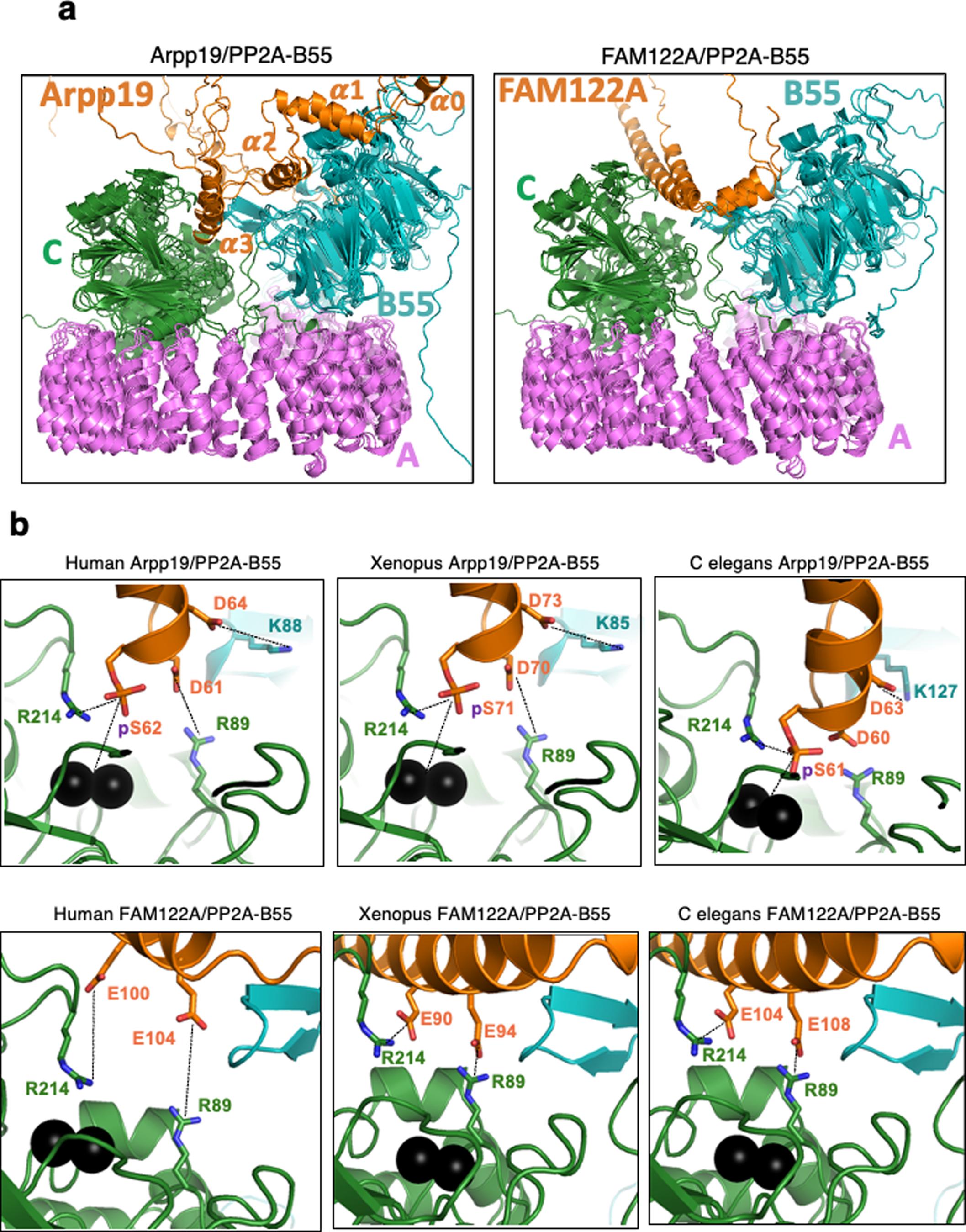 (A) Superposition of the models of Arpp19/ENSA and FAM122A in complex with ternary PP2A-B55 as predicted by Alphafold_multimer v 2.2 for three species (human, Xenopus and C. elegans). Arrp19/ENSA and truncated FAM122A are in orange ribbon while PP2A-B55 is in blue (B55), dark green (catalytic C subunit) and pink (the scaffold A subunit). (B) Zoom onto the entrance of the catalytic site of PP2A in complex with human Arpp19 and FAM122A. Manganese ions are shown as black spheres and sidechains are drawn as sticks with carbon colours as the corresponding polypeptide chains. Figure was drawn using Pymol (http://www.pymol.org).