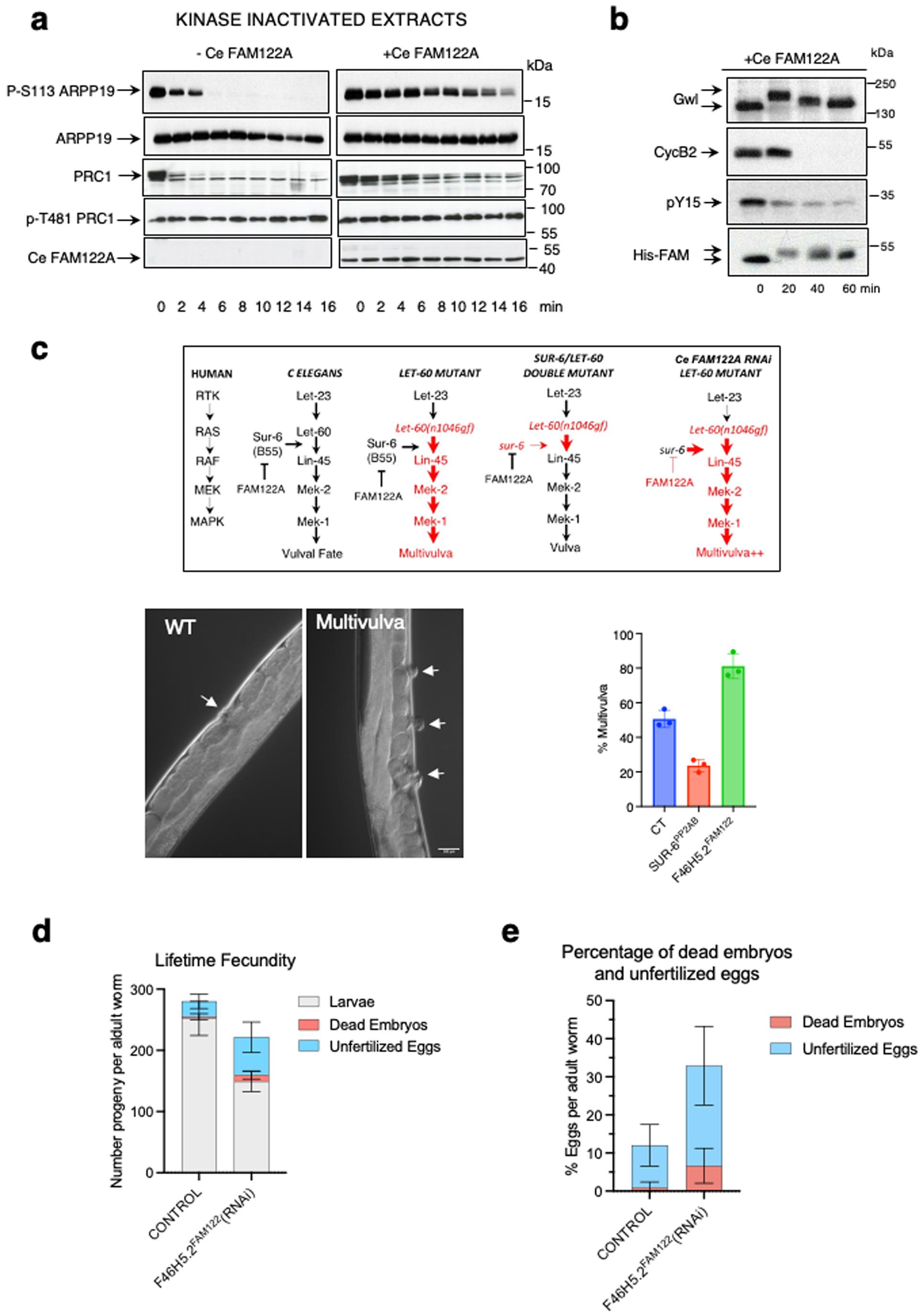 (A) Arpp19 or PRC1 “in vitro” phosphorylated by PKA or Cdk1 respectively were supplemented together with Ce FAM122A to interphase extracts and the levels and dephosphorylation rate of S113 of Arpp19 or T481 of PRC1, as well as the amount of Ce FAM122A, were analysed by western blot. (B) Ce FAM122A was added to interphase extracts and the levels and phosphorylation of the indicated proteins measured by western blot. (C) Scheme representing the genetic dependences of the gain of function let-60(gf) mutant and sur-6 (B55 orthologue) mutant on multivulva phenotype in C. elegans. sur-6 mutant (diminishes PP2A-B55 activity) on a let-60(gf) mutant background decreases the multivulva phenotype. Conversely, the depletion of F46H5.2 (FAM122A orthologue) in a let-60(gf) mutant background significantly increases this phenotype suggesting that, as expected, F46H5.2 protein would act as an inhibitor of PP2A-B55 in C. elegans. Big red arrows: increased multivulva phenotype. Shown are two representative images of a wildtype worm displaying one vulva or a mutant worm with a multivulva phenotype. The percentage of worms displaying multivulva phenotype in each mutant is represented as a mean +/− standard deviation. Significant differences calculated by non-parametric two tailed Mann-Whitney test are shown. (D) The number of larvae, dead embryos and unfertilized eggs were counted for control and F46H5.2(RNAi) worms and represented as mean values +/− standard deviation. (E) The percentage of dead embryos and unfertilized eggs were counted in worms at first day of adulthood and represented as for (D). Source data are available online for this figure.