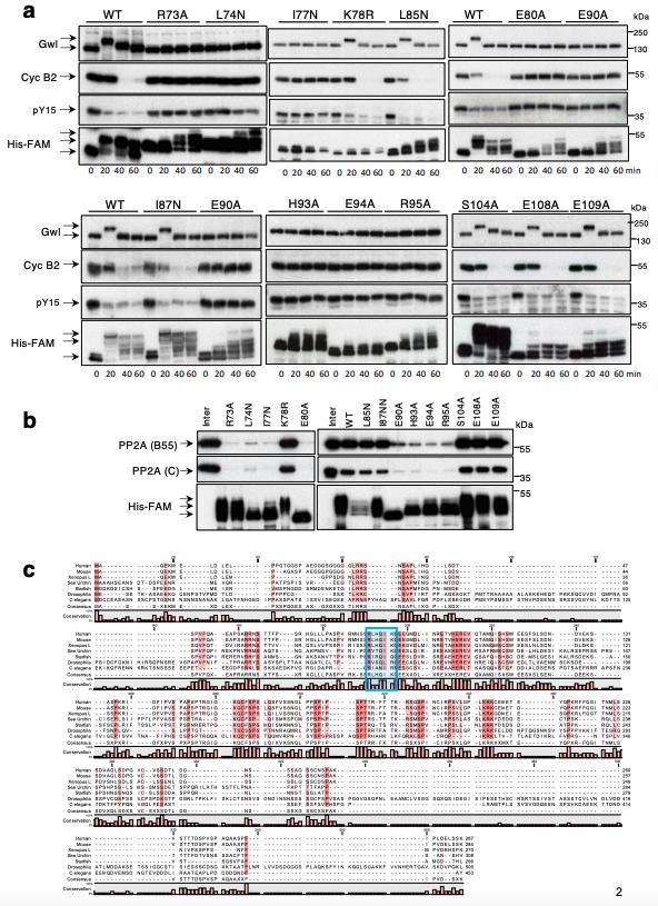 B55/C binding to the single mutants of the aH1 and aH2 is measured by His-pull down. (c) FAM122A sequence alignment