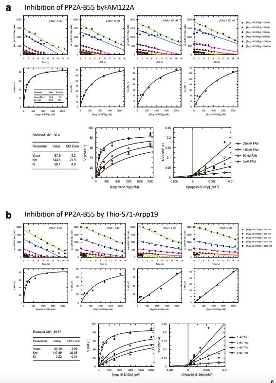 fitting results are shown below each panel. (b) Inhibition of PP2A-B55 by Thio-S71-Arpp19 was fitted as for (a).