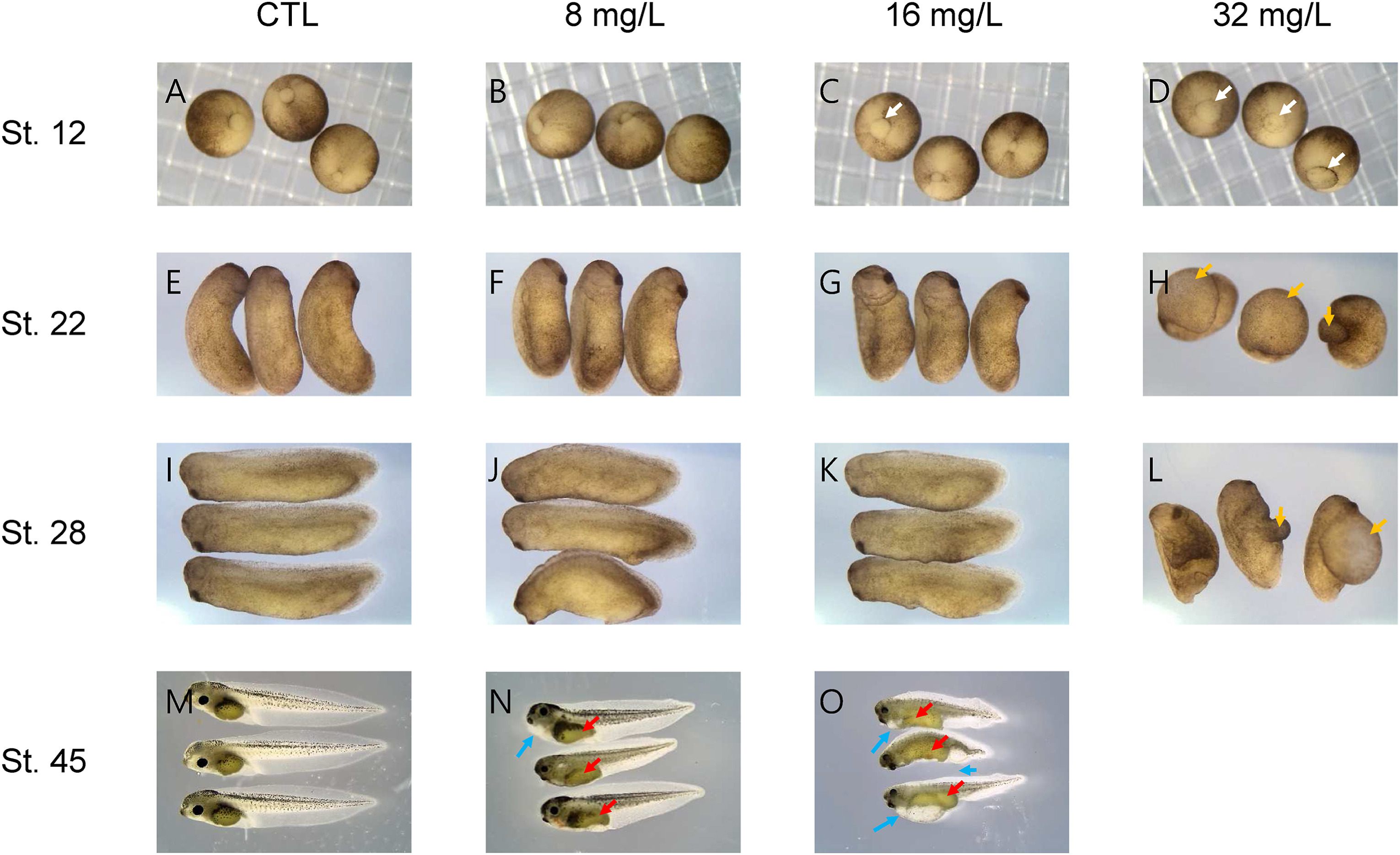 Fig. 1. Representative malformations of embryos exposed for 96 h to ibuprofen at 0, 8, 16, or 32 mg/L. Gross anatomical analysis was performed at developmental stages 12, 22, 28, and 45 after Xenopus embryos were treated with various concentrations of ibuprofen (A–O). The control group (CTL, left panel) shows the normal shape of the stage. Delayed blastopore closure (white arrow) was observed ibuprofen treated embryos. Herniated endodermal mass (yellow arrow) was observed on the ventral midline of the trunk in the ibuprofen treated embryos. They showed delayed or absence of intestinal coiling (red arrow), blister formation (blue arrow) in the head, heart and trunk, and severe microcephaly. (For interpretation of the references to colour in this figure legend, the reader is referred to the Web version of this article.)
