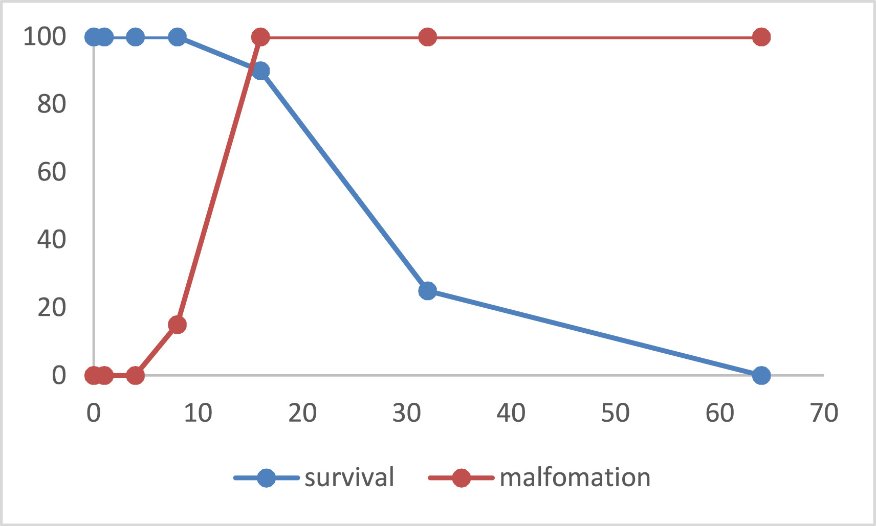 Fig. 2. Results of lethality and teratogenesis in Xenopus laevis exposed for 96 h to different concentrations of ibuprofen.
