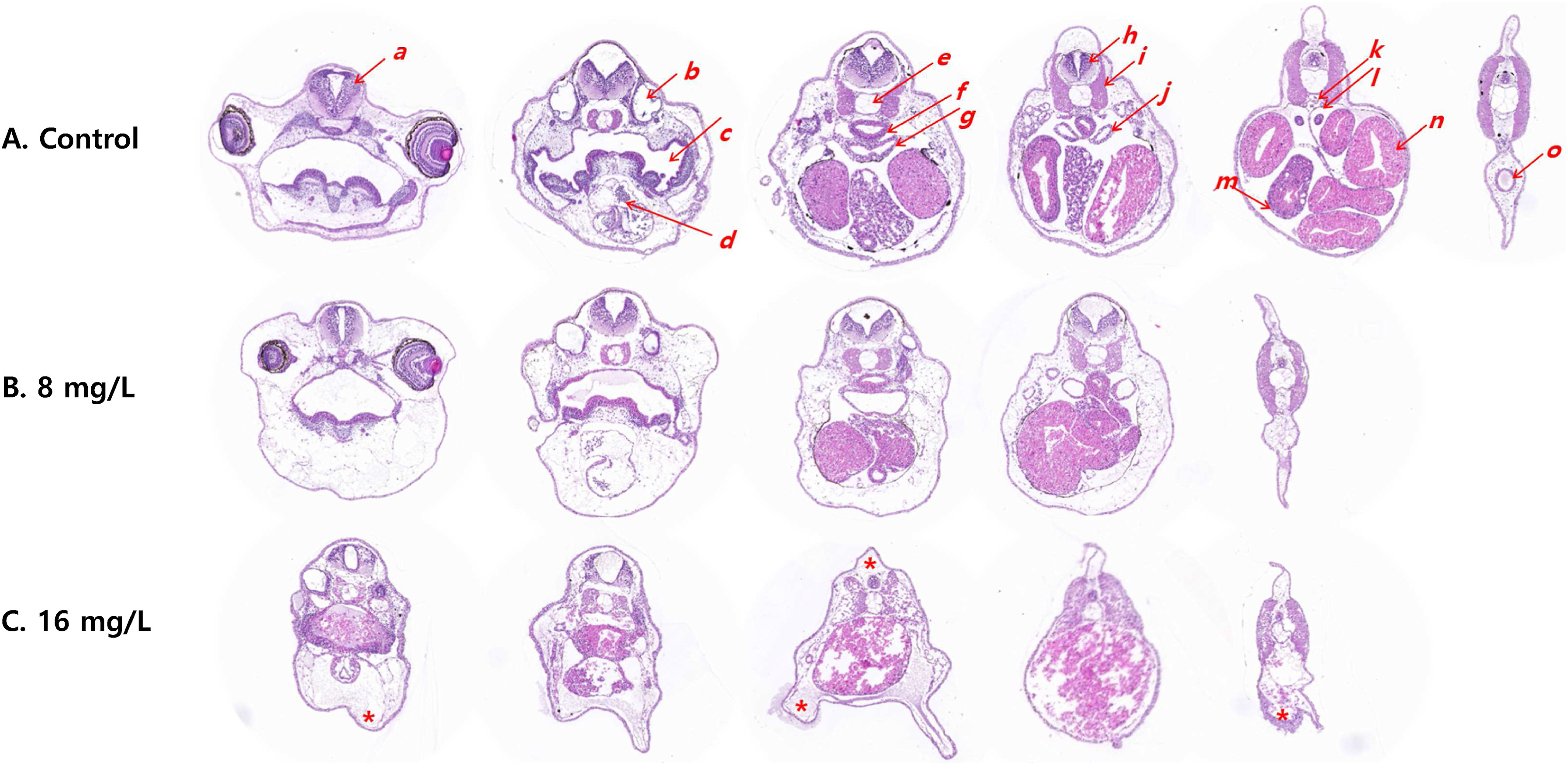 Hematoxylin and eosin staining of transverse sections was performed at developmental stage 46 in Xenopus embryos treated with ibuprofen. The control group (CTL, upper panel) had a normal shape suitable for their developmental stage. The larvae treated with 8 mg/L ibuprofen (middle panel) showed an edematous subcutaneous space throughout the body. All observed organs were smaller, shorter and underdeveloped in the ibuprofen-treated embryos. An underdifferentiated yolky mesenendodermal mass was observed. Severely disrupted organs were observed in embryos treated with 16 mg/L ibuprofen (lower panel). The cranial to caudal order is presented from left to right. The red arrows indicate a: diencephalon, b: optic vesicle, c: branchial cavity, d: heart, e: notochord, f: esophagus, g: trachea, h: rhombencephalon, i: somite, j: lung, k: dorsal aorta, l: ureter, m: liver, n: stomach, o: anal tube, and the red stars represent blisters. (For interpretation of the references to colour in this figure legend, the reader is referred to the Web version of this article.)