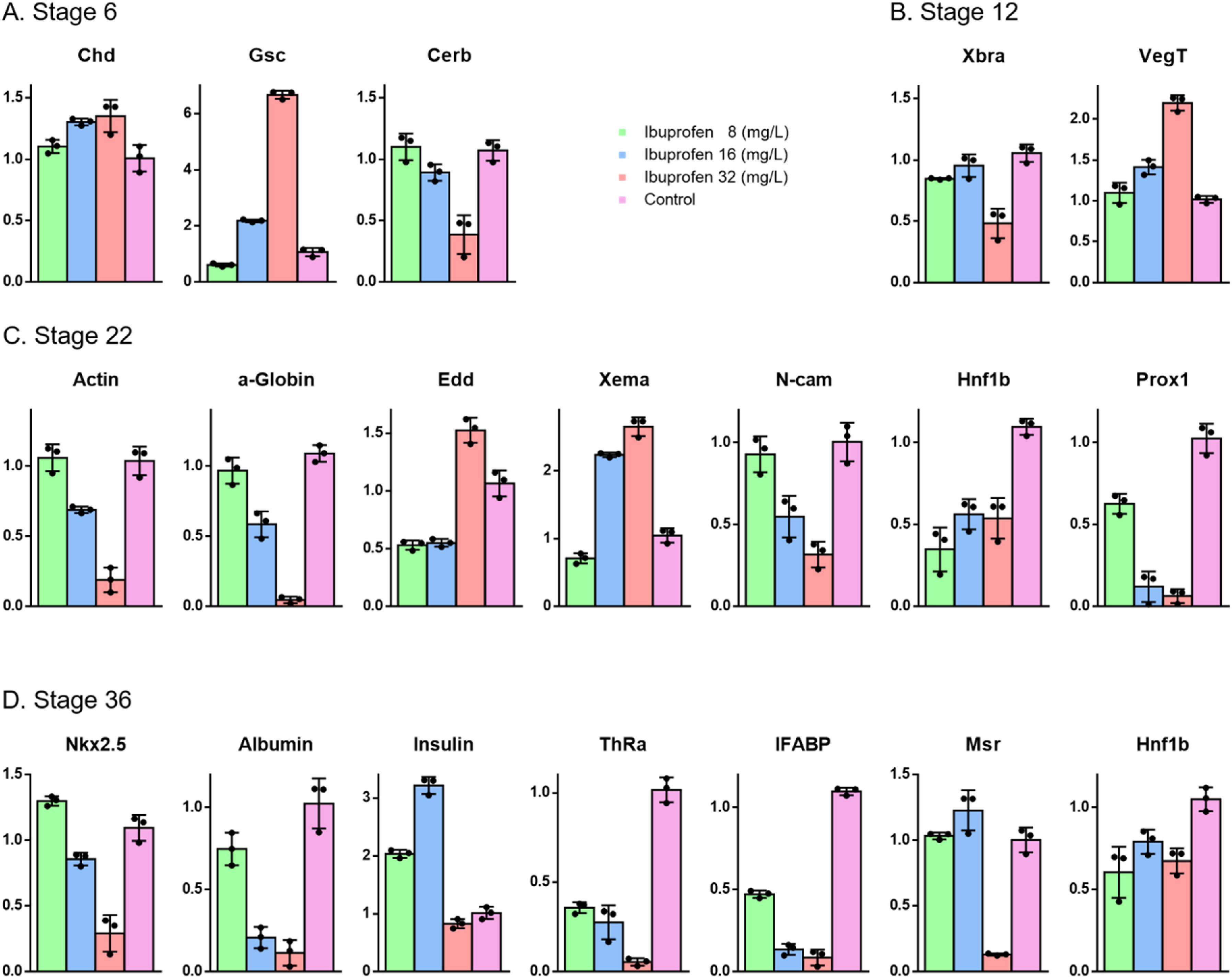 Fig. 4. Gene expression patterns were analyzed in whole X. laevis embryos following ibuprofen treatment. Embryos were harvested at stages 6 (A), 12 (B), 22 (C), and 36 (D) for detection of expression changes in markers of early developmental genes and organogenesis genes. Generally, the expression of each organ marker was changed or downregulated in the ibuprofen-treated group compared with the control group in a concentration-dependent manner.