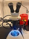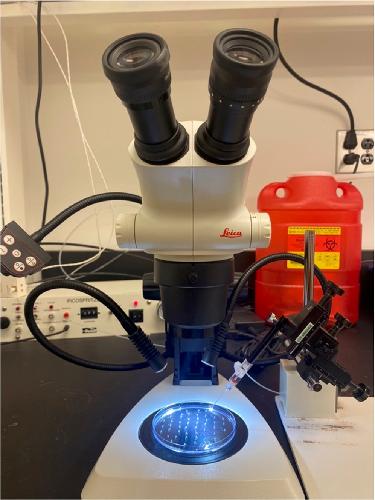 Figure 2. Microinjection rig setup with loaded capillary and tadpoles oriented for injection