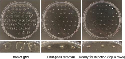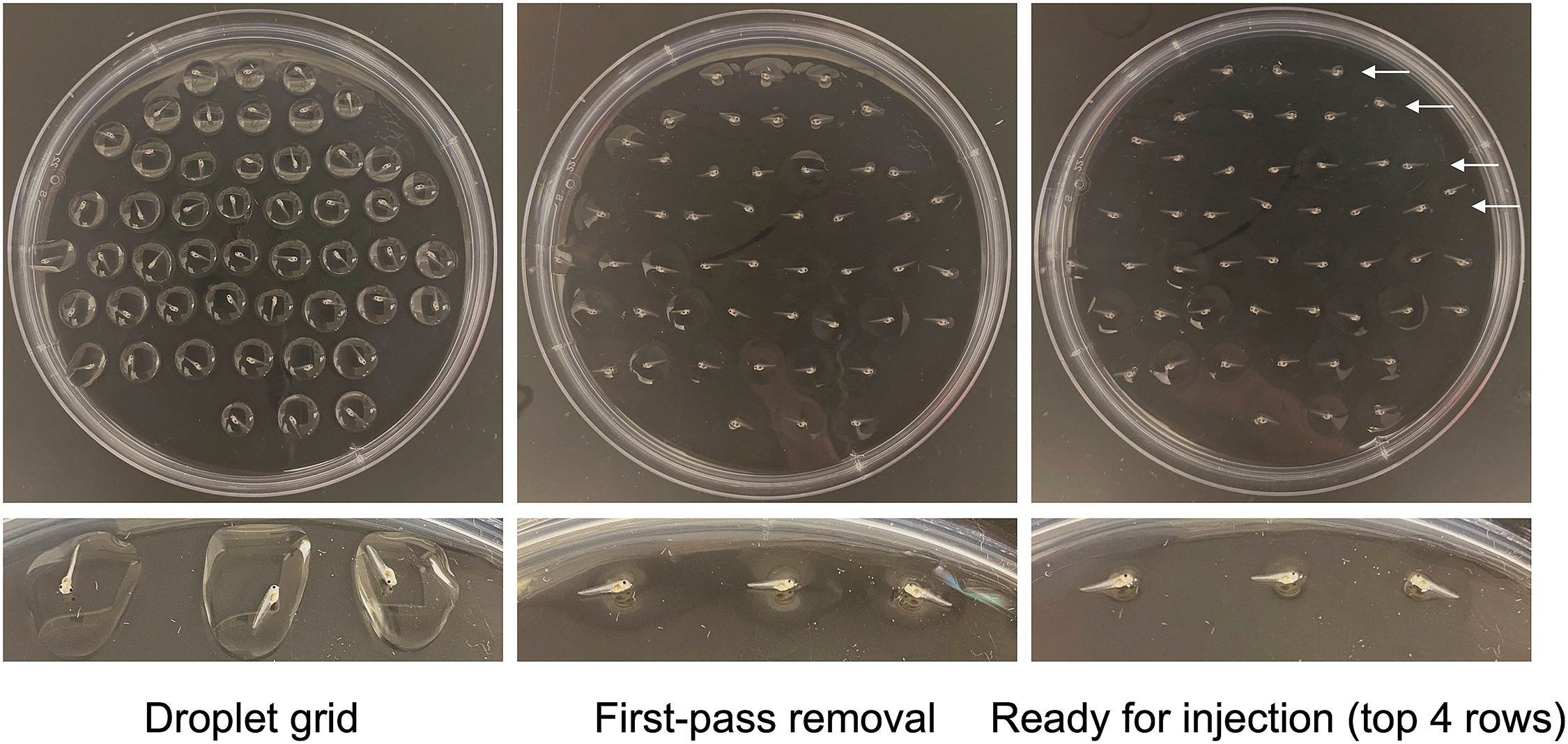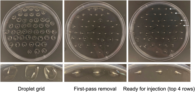 Figure 3. Plating of tadpoles for injectionStart by plating a grid of tadpoles in individual droplets. Then, orient tadpoles with ventral sides in the same direction while removing most of the media. Anterior/posterior orientation does not matter. Finally, to prevent movement when injecting, remove as much of the media from each tadpole as possible. As an example, the top 4 rows of panel 3 show tadpoles ready for injection, compared to the bottom 4 rows. Top 4 rows are denoted by arrows.
