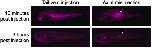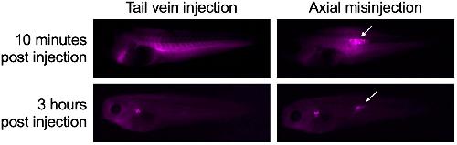 Figure 5. Expected results after injection with fluoro-RubyStage 41 tadpoles after injection with 4 nL of 500 μM fluoro-Ruby. At 10 min, the signal is seen in the vasculature between somites if injected into the tail vein. By 3 h post injection, the signal is largely accumulated in the kidney. If misinjected, the fluorescent dye accumulates strongly at 10 min and 3 h post injection. At 3 h post injection, some of the dextran will end up in the circulatory system and in the kidney, but the mis-targeted injection is still clearly visible. Arrows denote misinjection site.
