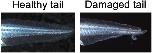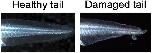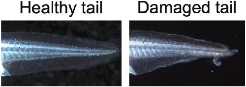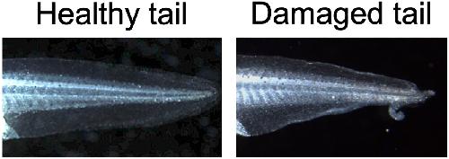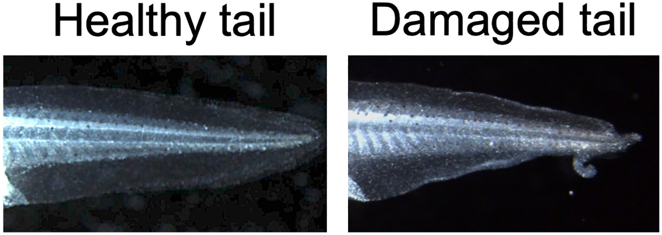 Figure 6. Tadpoles after recovery from injectionAfter completing this protocol, tadpoles should appear as on the left with minimal injury to the tail. If the tadpoles dry to the plate or injections take too long, the tail will be damaged as on the right. This most often leads to tearing of the fin tissue at the posterior of the tail.