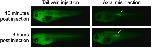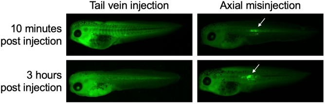 Figure 4. Expected results after injection with 2NBDGStage 41 tadpoles after injection with 4 nL of 5 mM 2NBDG. At 10 min, the signal is clearly seen in the vasculature between somites if injected into the tail vein. Signal is more uniformly distributed throughout most tissues by 3 h post injection. If misinjected, the fluorescent dye accumulates strongly at 10 min and 3 h post injection, seen by a much stronger signal in the notochord or somites. Each column is the same tadpole imaged at each time point. Arrows denote misinjection site.