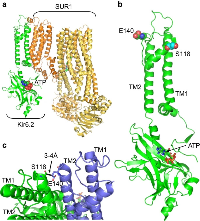 Location of S118L in Kir6.2. (a) Structural model of one pore-forming (Kir6.2, green) and one regulatory (SUR1, orange/yellow) subunit of KATP in an inhibited state (from Protein Data Bank [PDB] accession no. 6baa), with ATP bound to Kir6.2 and glibenclamide (not visible) bound to SUR1. (b) Side view, showing the position of S118 (cyan) at the start of the pore helix and E140 (green) at the top of transmembrane domain 2 (TM2). (c) Detail of two adjacent Kir6.2 subunits (one green, one blue) showing the close proximity (<4 Å) between S118 from one subunit with E140 from the neighbouring subunit