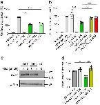 Glibenclamide rescues surface expression of hetKir6.2-S118L KATP channels. (a) Surface expression of HA-tagged or untagged SUR1 co-transfected with Kir6.2 (wild-type, grey bar, n=5), hetKir6.2-S118L (hetS118L; dark green bar, n=3) or homKir6.2-S118L (homS118L; light green bar, n=3). (b) Surface expression of HA-tagged or untagged SUR1 co-transfected with Kir6.2 (wild-type, dark grey bar, n=7), or hetKir6.2-S118L (dark green bar, n=7) cultured at 37°C in the absence of drug. Glibenclamide (5 µmol/l) was added to the media to promote surface membrane trafficking of wild-type and mutant constructs (wild-type, HA+Glib, light grey, n=4; hetKir6.2-S118L,_HA+Glib, olive bar, n=4). HetKir6.2-S118L was cultured at 28°C in the absence of drug (red bar, n=3). (c) Representative western blot for total SUR1 (~180 kDa) and α-tubulin (~50 kDa) proteins, in total protein lysates from HEK cells expressing wild-type Kir6.2 (ctrl), hetKir6.2-S118L (het) co-expressed with SUR1-HA, or not transfected (nt). Molecular mass markers shown on the right side of the blots are in kDa. (d) Quantification of the SUR1 bands, shown as a relative fold change against wild-type. Box plots show individual data points and mean ± SEM from three to seven independent transfections. **p<0.05, **p<0.01, ***p<0.001 (one-way ANOVA followed by the post hoc Dunnett’s test for multiple comparisons)