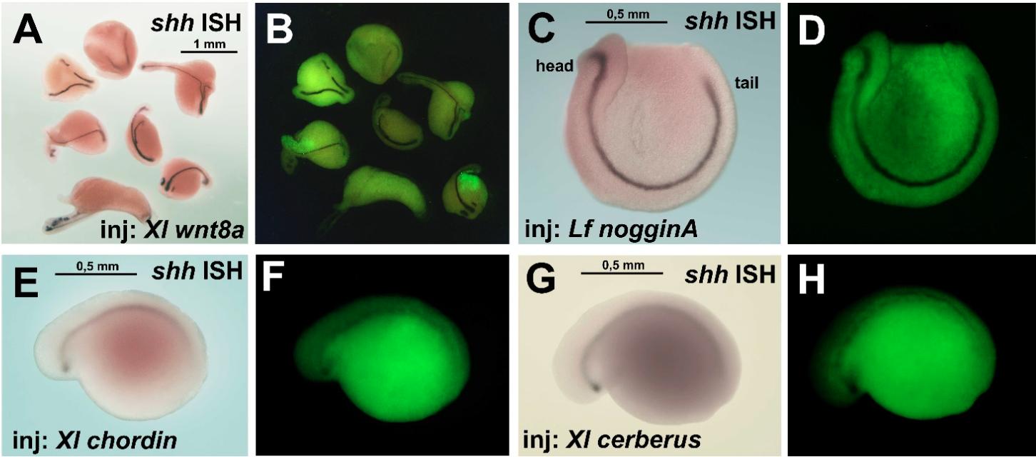 Figure 1. Induction of secondary body axes upon injection of nogginA, nogginB, nogginC and wnt8a mRNAs in X. laevis and L. fluviatilis embryos. (A–F) Injections of lamprey nogginA, nogginB and nogginC mRNAs induce secondary axes in X. laevis. (G,H) Injections of lamprey nogginB mRNA do not induce secondary axes in L. fluviatilis embryos. (I,J) Injections of amphibian wnt8a mRNA induce secondary axes in L. fluviatilis embryos. (K) sonic hedgehog (shh) expression in L. fluviatilis embryos detected by ISH in an uninjected control embryo. (L,M) Detection of secondary axes in L. fluviatilis embryos by sonic hedgehog (shh) ISH. (N) Proteins, translated from injected Xl_noggin1-Myc and Lf_BMPa-Flag mRNAs, are detected in lamprey embryos at stages 17 and 21.