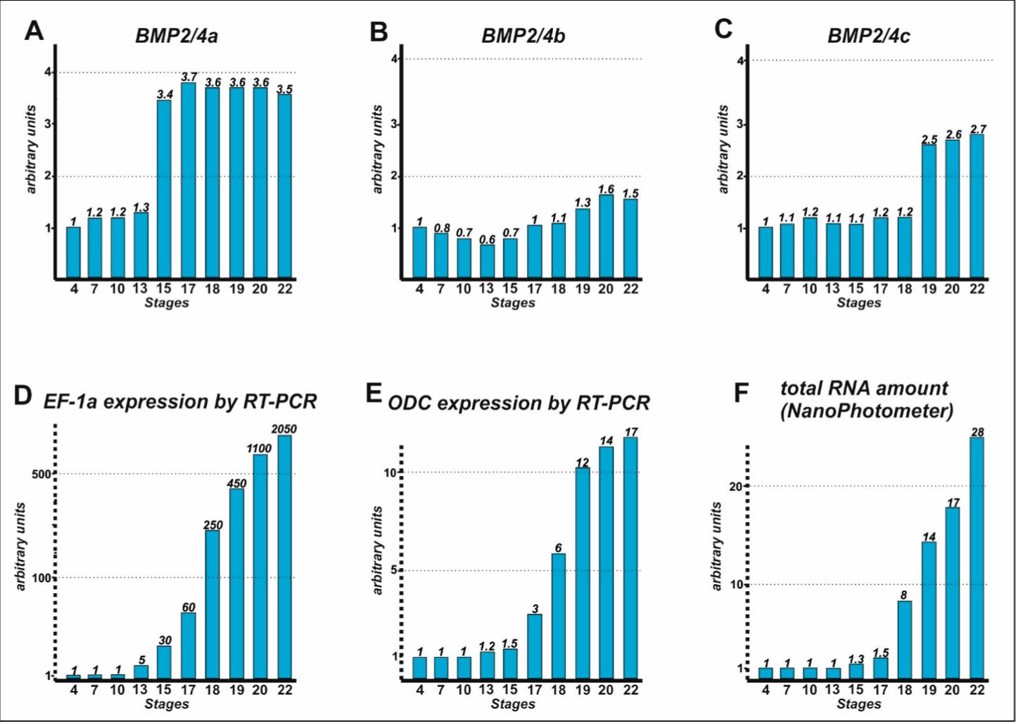 A - C - qRT-PCR analysis of BMP2/4a, BMP2/4b and BMP2/4c expression at early embryonic stages of L. fluviatilis normalized by expression of housekeeping genes EF-1a and ODC.