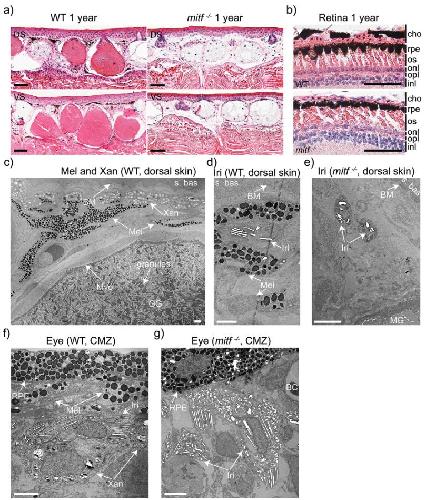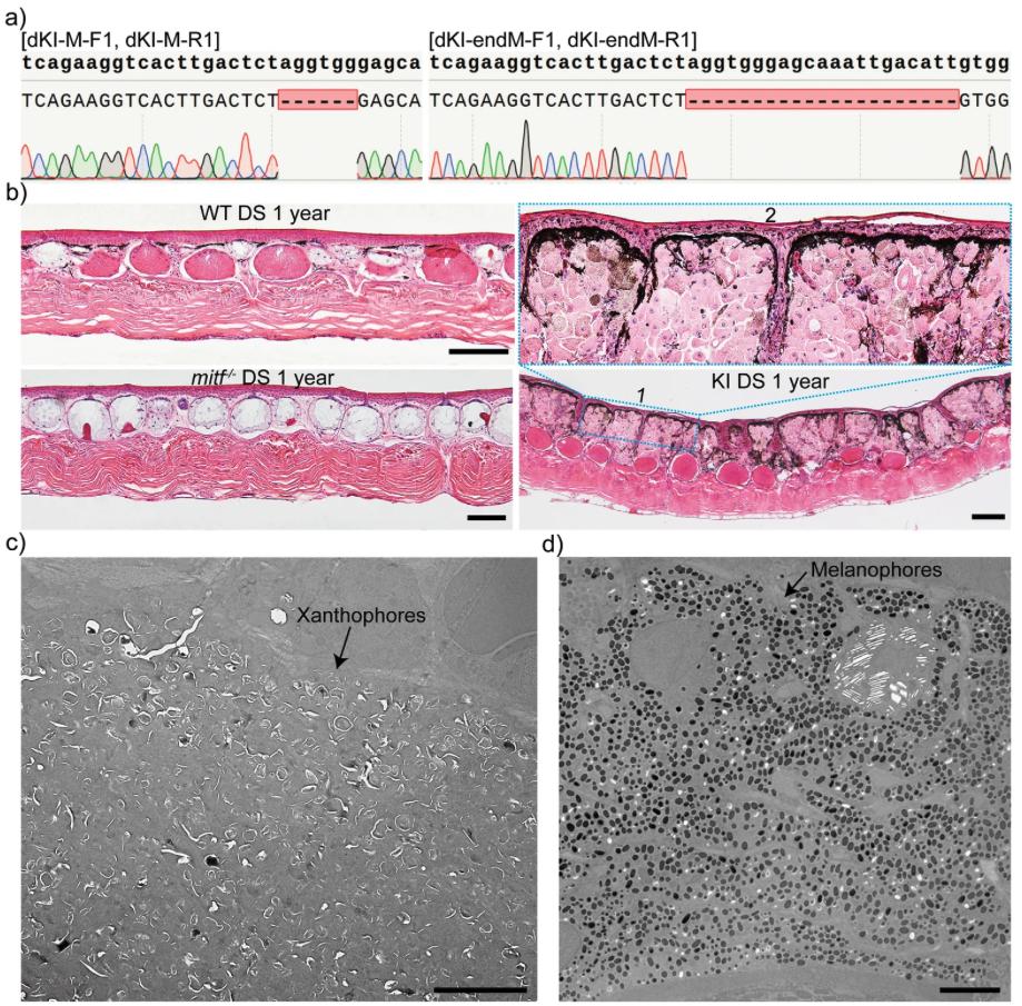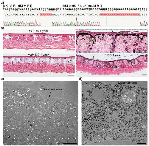 Fig. 1: Biallelic mitf disruption makes Xenopus tropicalis transparent within two months post-metamorphosis.