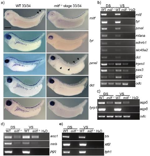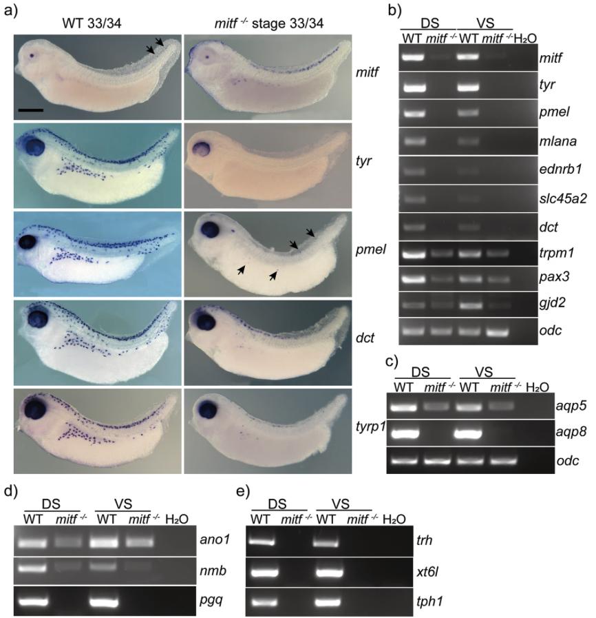 a Whole-mount in situ hybridization analysis of stage 33/34 Xenopus tropicalis embryos demonstrated a reduction or absence of mRNA hybridization signals in mitf/ embryos compared to the WT. The black arrows indicated some weaker mRNA hybridization signals. At least five embryos were used for in situ hybridization of each gene in every genotype embryo. be Representative results of RT-PCR analysis for several melanophores-related genes, including mitf, tyr, pmel, mlana, ednrb1, slc45a2, and dct, as well as xanthophores-related genes, trpm1, pax3, and gid2, were presented in b. The expression of aquaporin-related genes, such as aqp5 and aqp8, as well as Ca2+-activated chloride channel anoctamin 1 (ano1), and antimicrobial peptides-related genes, including nmb and pgq, in the granular glands were displayed in c and d, respectively. Several hormone-related genes of granular glands, including trh, xt6l, and tph1, were also evaluated (e). The representative results of this analysis were presented in panels ce. odc was used as the RNA loading control and ce shared the RNA loading control in c. For RT-PCR analysis, each gene was subjected to three repetitions using three replicates of total RNA samples, while each total RNA sample was extracted from the skin of three individual frogs. The original data for the mentioned RT-PCR can be found in Supplementary Fig. 32 and Supplementary Fig. 33. Additionally, the original data for the RT-PCR in Supplementary Fig. 25 can be found in Supplementary Fig. 34. DS, dorsal skin; VS, ventral skin. The black scale bar in a is 0.5mm.